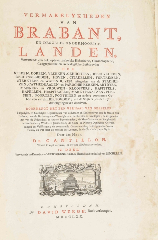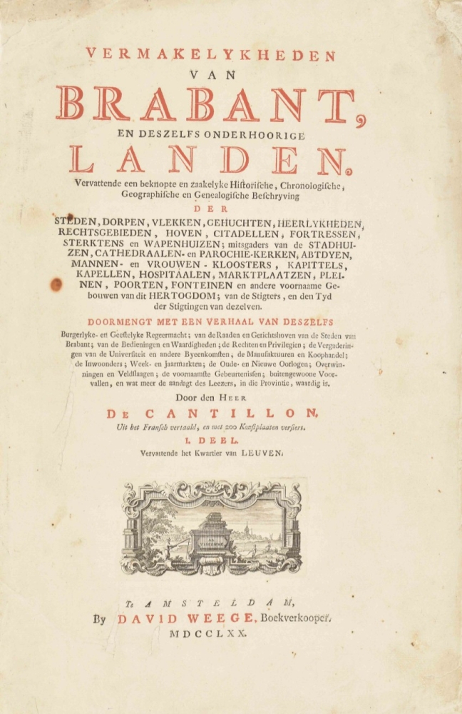 Vervattende een beknopte en zaakelyke historische, chronologische, geographische en genealogische beschryving der steden, dorpen, vlekken, (...) kloosters (...) en andere voornaame gebouwen van dit Hertogdom. De Cantillon. Amsterdam, David Weege, 1770.