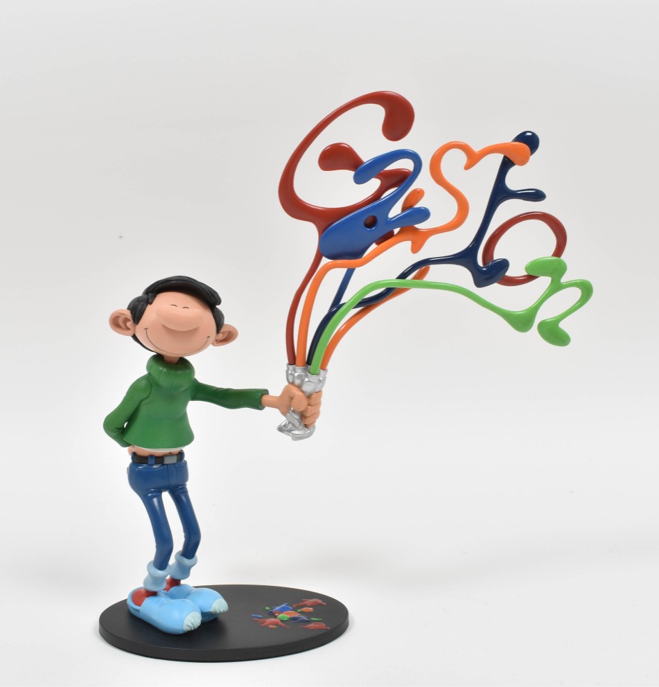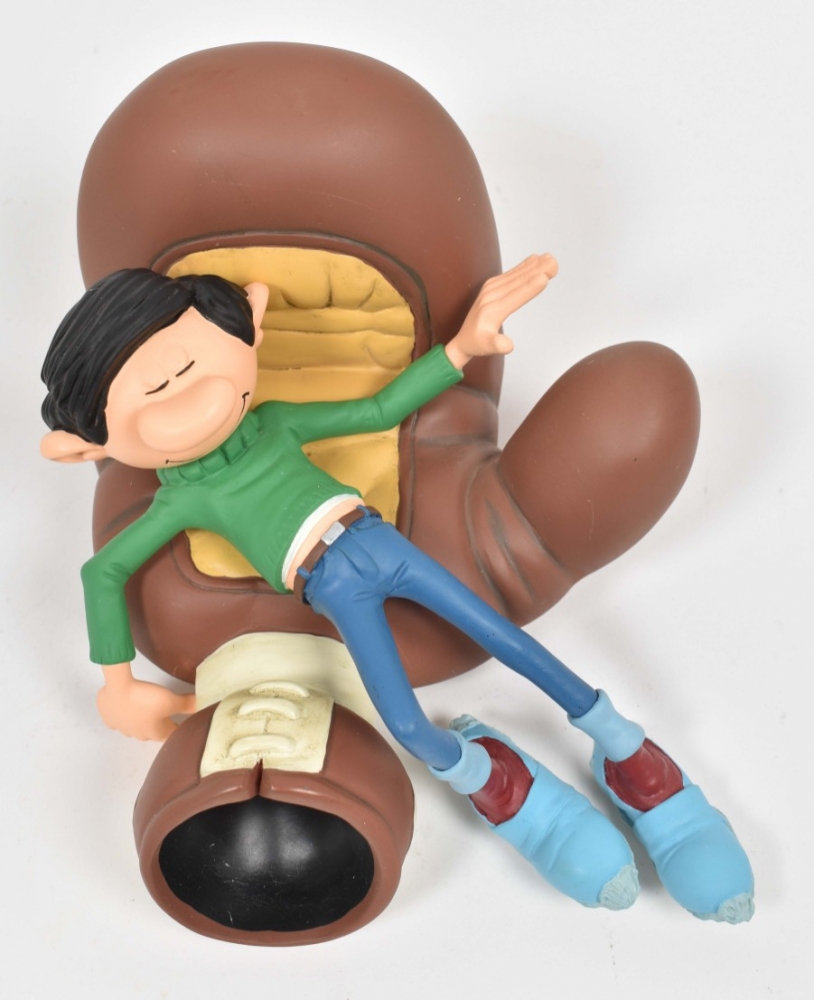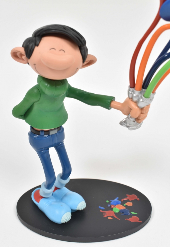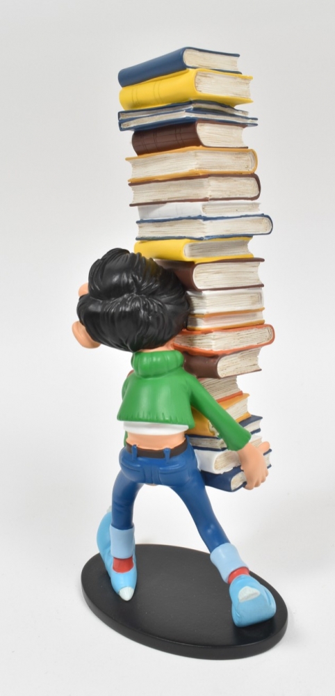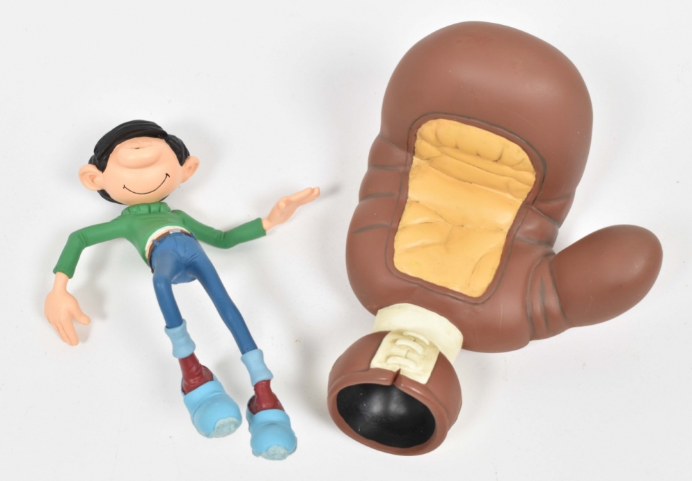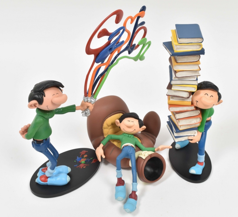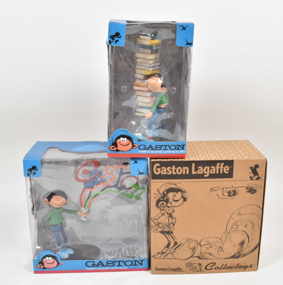 Gaston Pile de Livres. Collectoys, 2006. h. 24.7 cm. In box + Gaston Splash! Collectoys, 2014. 19 cm. + Gaston Lagaffe. Sur le Gant de Boxe. Marsu, 2009. In box.