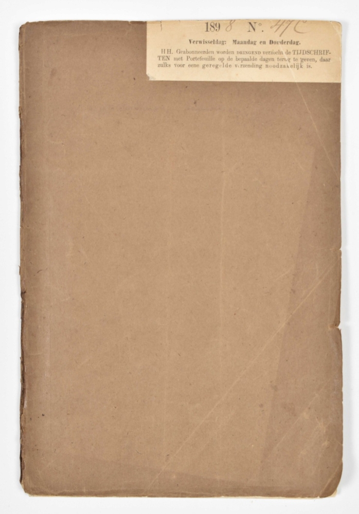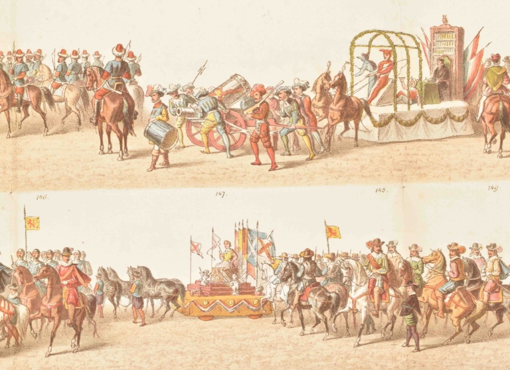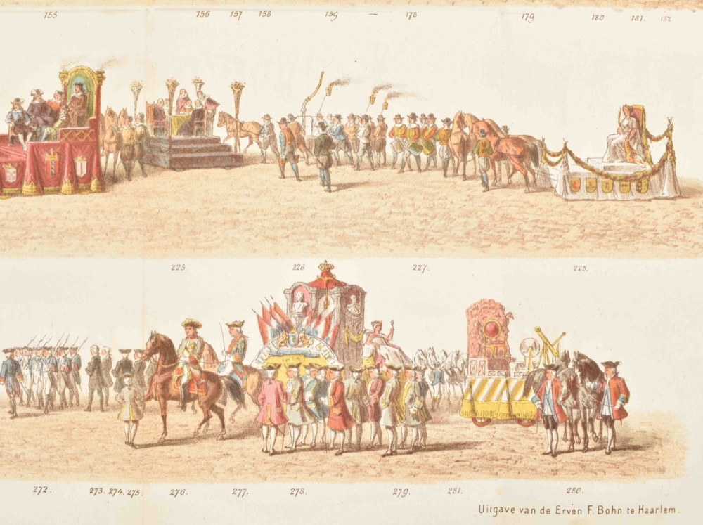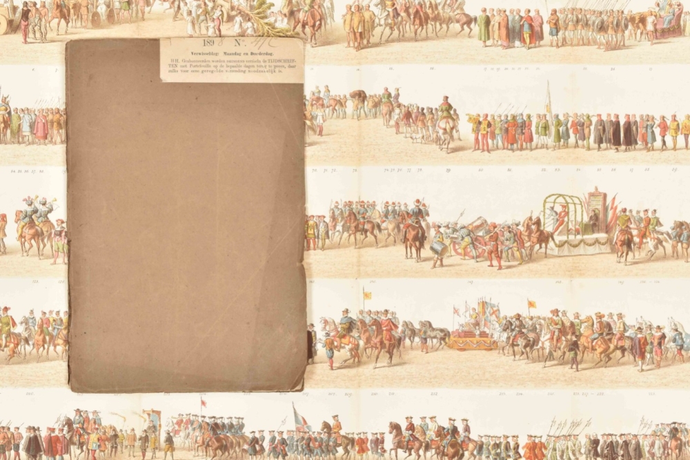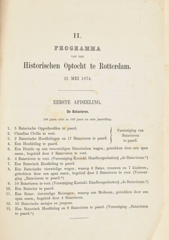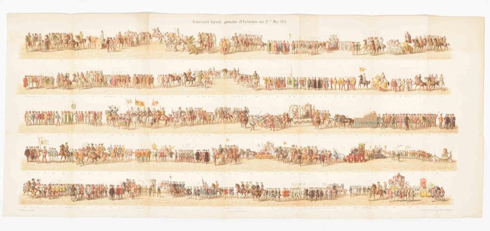 Brochure with the large folding colour lithograph "Historische Optocht, gehouden te Rotterdam den 21sten Mei 1874". Brown wrapper, 12 pp. and consecutive numbering of the 15 parts of the parade 1-281 as seen on the colour lithograph (45 x 106 cm).