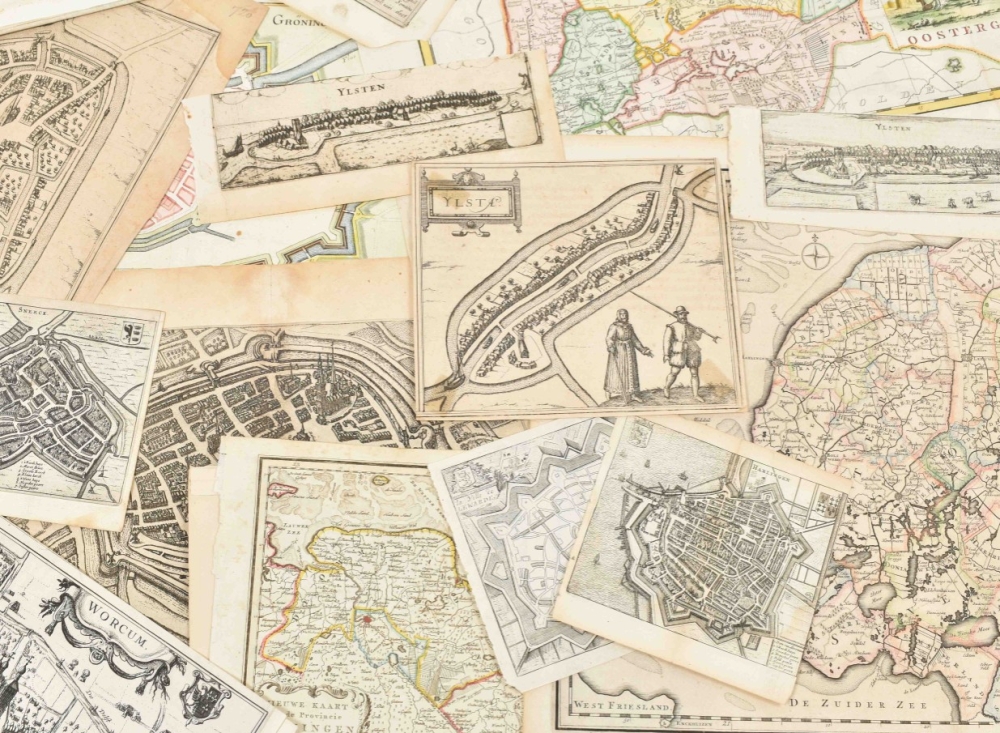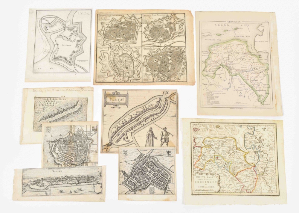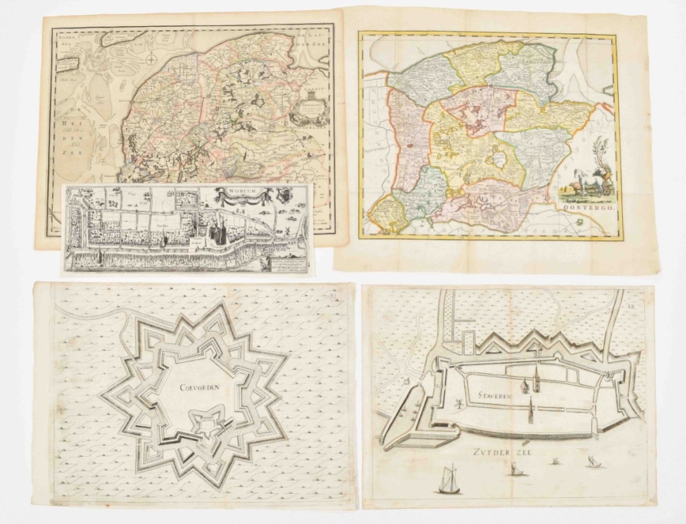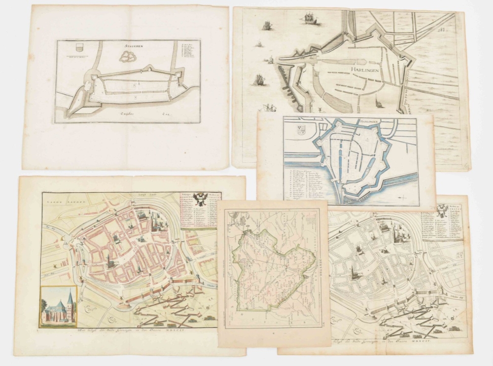 Friesland: 12 maps (c. 1600-1620) incl. Guicciardini 3x, of which 1 coloured, a coloured Tirion map sheet, various map sheets and general maps (18th century) in colour + 6 fortification maps + 27 plans in various sizes from Braun & Hogenberg, Guicciardini, Blaeu and various 18th-century publications.