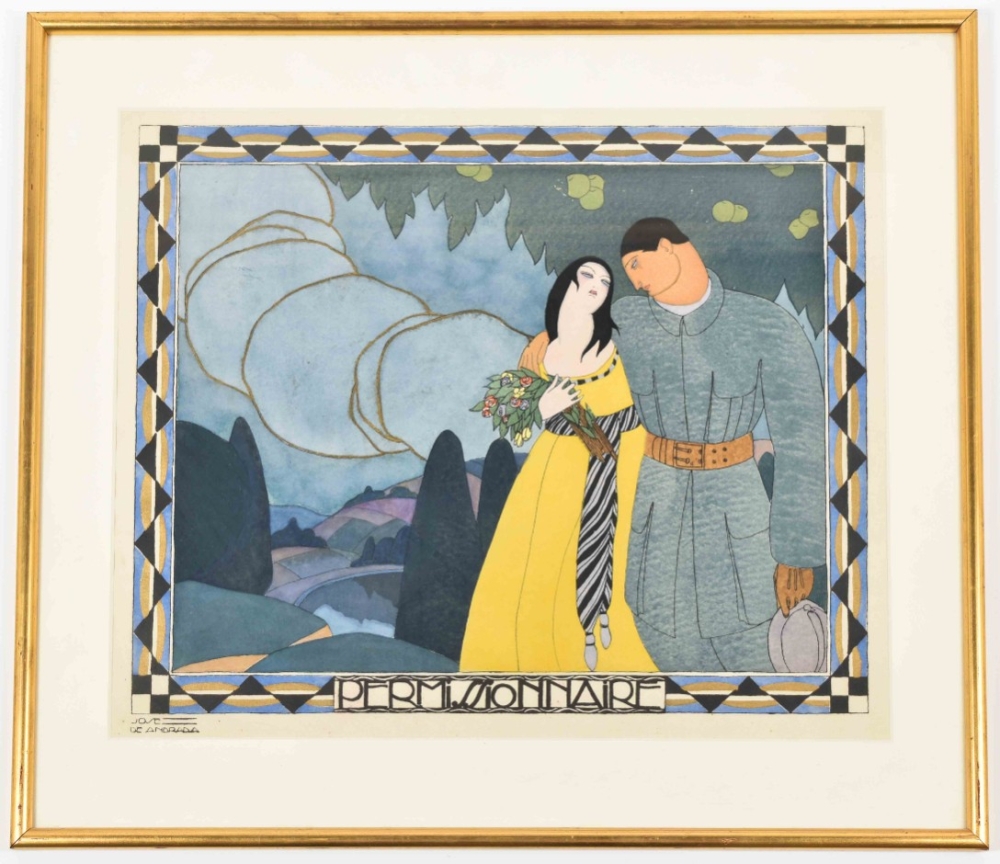 Pochoir. Circa 1915. In frame (45 x 51 cm) behind glass in passe-partout (35 x 41 cm).