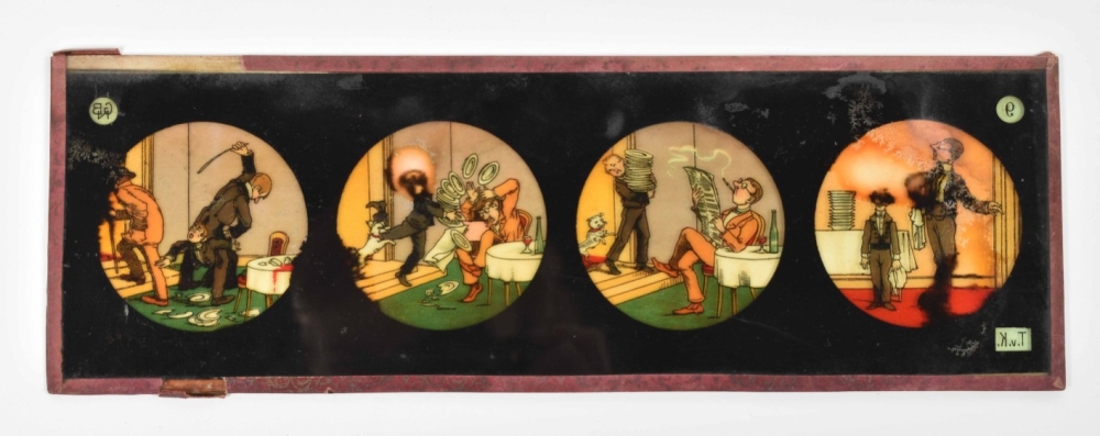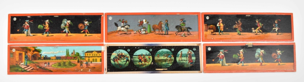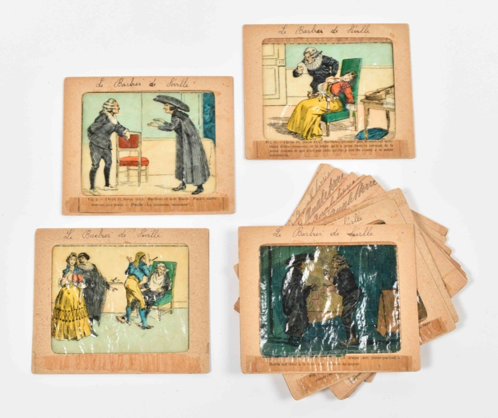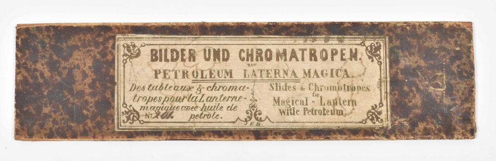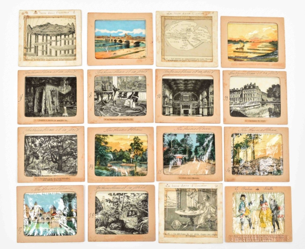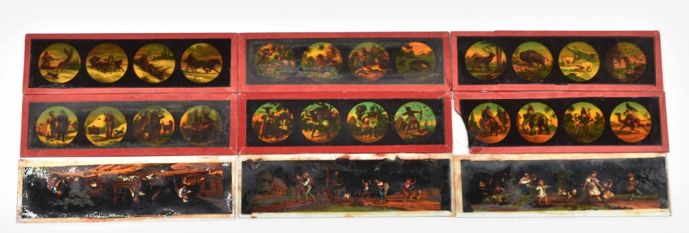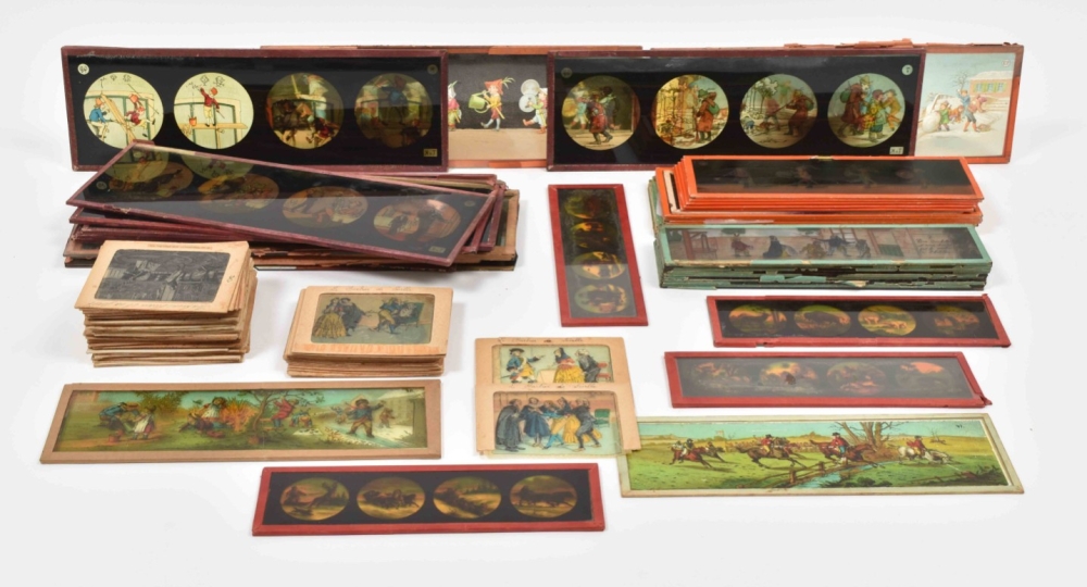 52 glass slides, mostly German, c. 1870-1900. Cont. fairytale images, animals, Ice fun etc.