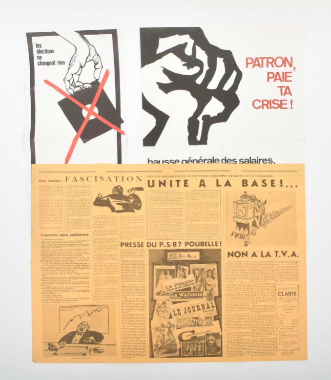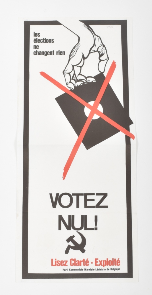 Parti Communiste Marxiste-Leniniste de Belgique. Bruxelles, febr. 1977. Poster. 55 x 40 cm. (2) 'Les elections ne changent rien.' Poster of the same. 1976, 55 x 25 cm.