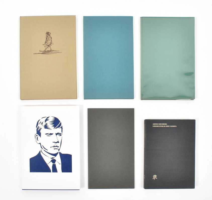 Utrecht, De Roos, 2012. Suede boards with dust-j. Ill. by Hugo Kaagman. 175 numbered copies. 8vo. (2) Arnon Grunberg. Undercover in Europa. Idem, 2011. Book design: Irma Boom. Cloth. 175 numbered copies. sm. 8vo. (Lacks poster wrapper).