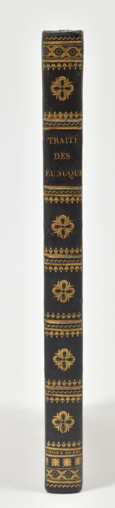 dans lequel on explique toutes les différentes sortes d'eunuques, quel rang ils ont tenu, & quel cas on en a fait, &c. On éxamine principalement s'ils sont propres au mariage, & s'il leur doit être permis de se marier. Et l'on fait plusiers remarques curieuses & divertissantes à l'occasion des eunuques, &c. Par M***, D*** (Charles Ancillon). N,pl., (the Netherlands), 1707, (20),187 pp., finely bound in black half mor. by R. de Simier (modestly giltlettered signed at foot of spine), gilt and ribbed spine, 12mo (in 8vo size).