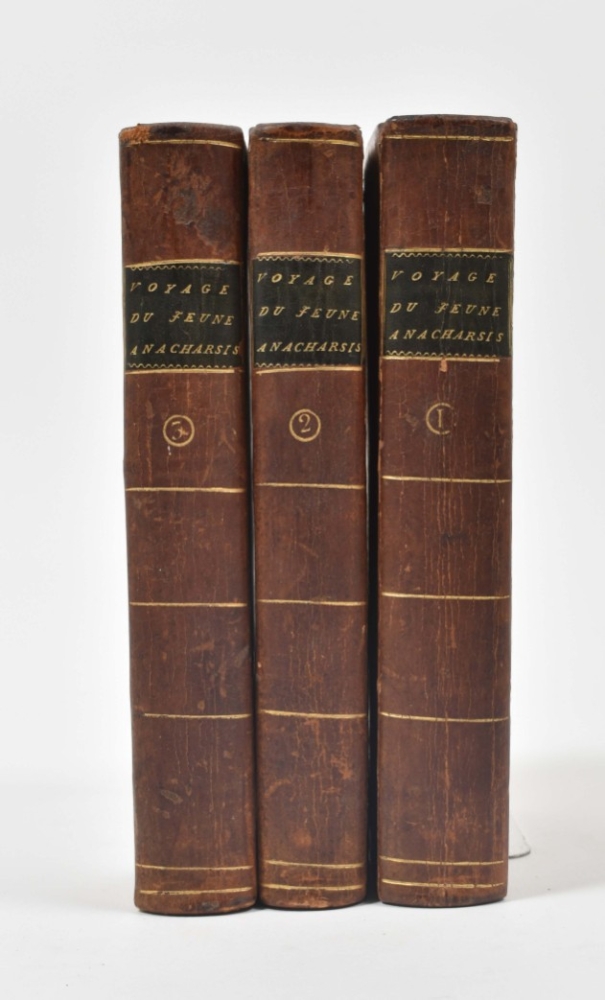 Some plates a bit foxed/ yellowed, sl. offsetting from turn-ins and some unobtrusive outer defects, but a fine copy with owner's entry "Eliza Were Clarke 1797" on first blank of all vols. Rare and relatively early edition in 3 vols., the first edition appeared in 1788. The first 31 pp. comprise an "Essai sur la vie de J.J. Barthélemy."