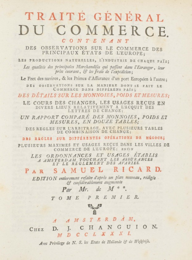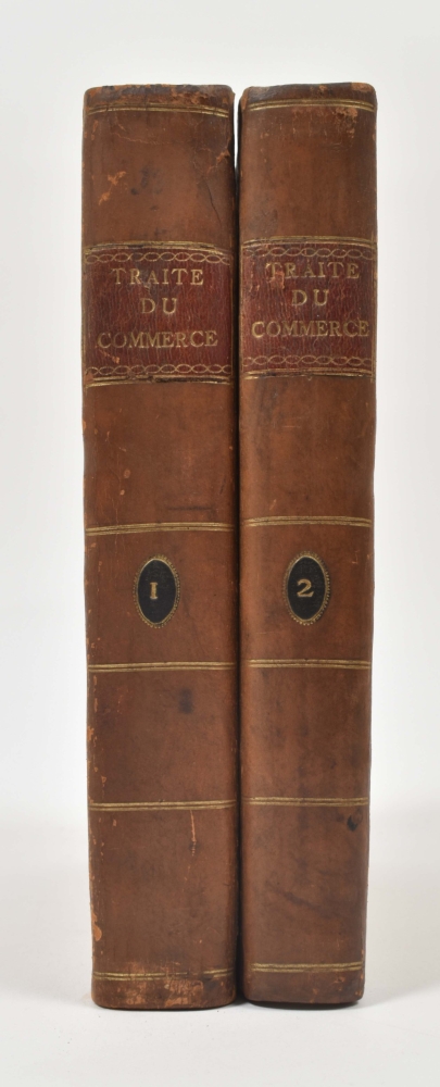 Contenant des observations sur le commerce des principaux états de l'Europe; les productions naturelles, l'industrie de chaque païs; les qualités des principales marchandises qui passent dans l'étranger, leur prix courant, & les frais de l'expédition; le fret des navires, & les primes d'assurance d'un port européen à l'autre; des observations sur la manière dont se fait le commerce dans différents païs; des détails sur les monnoies, poids et mesure; le cours des changes (...). Édition entièrement refaite (...) par Mr. de M**. Amst., D.J. Changuion, 1781, 2 vols., VII,(1),619,(5); (4),XVI,531,(5) p., contemp. unif. half calf, gilt spine w. 2 contrast. mor. letterpieces, 4to.