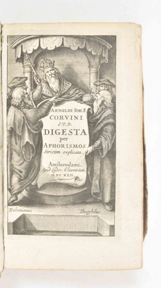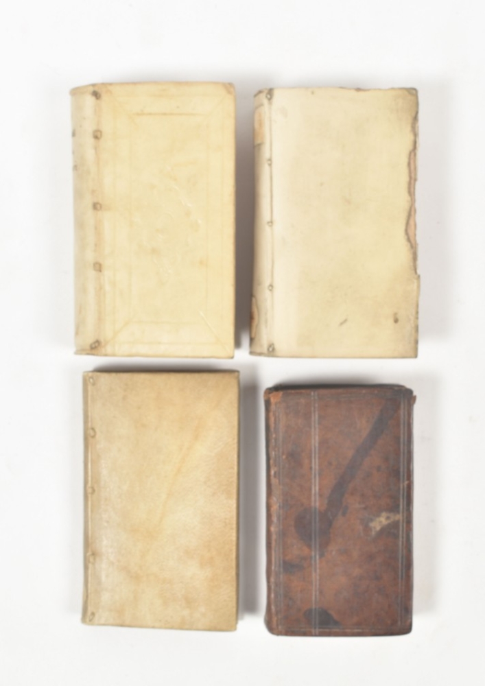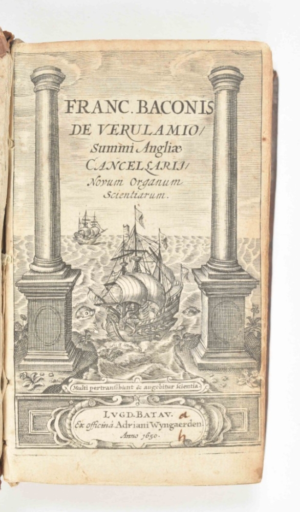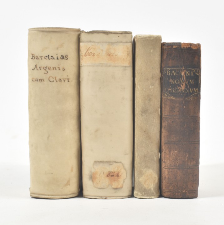 Upper endpapers a bit wormholed/ torn and w. library ticket on upper pastedown. Good, attractively bound copy. Willems 325, III: 'C'est celle qu'on préfère'. There are three editions with the same date and publisher. (2) Francis Bacon. De verulamio, summi angliae cancellarii, novum organum scientiarum. Leyden, "Ex officina Adriani Wyngaerden", 1650, (24),404 pp., engr. titla-p., contemp. blindtooled calf w. mor letterpiece on spine, 12mo. Lacks upper endpapers; lower pastedown detached from board; occas. other sm. internal and some external defects. Willems 1695. And 2 others by Corvinus (L. Elzevier, 1642) and Bouricius (Stettin, 1664). (total 4)
