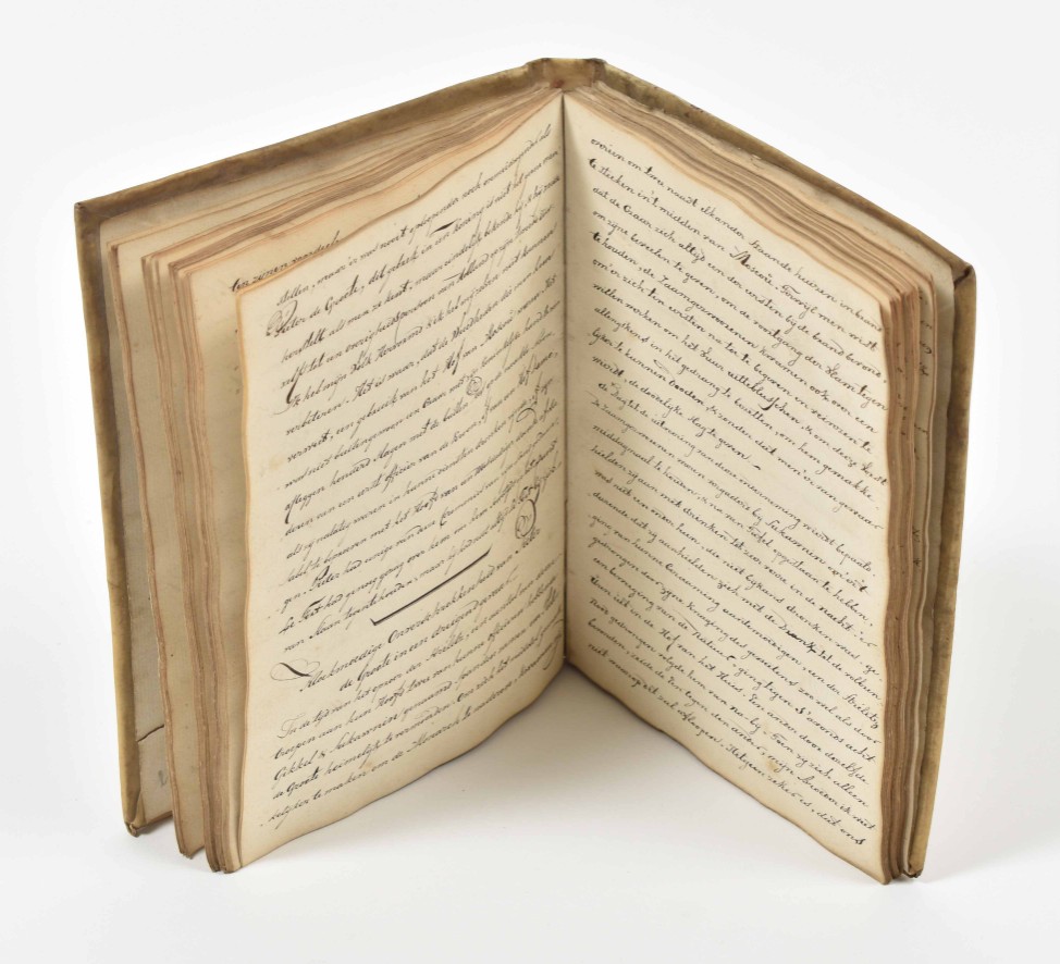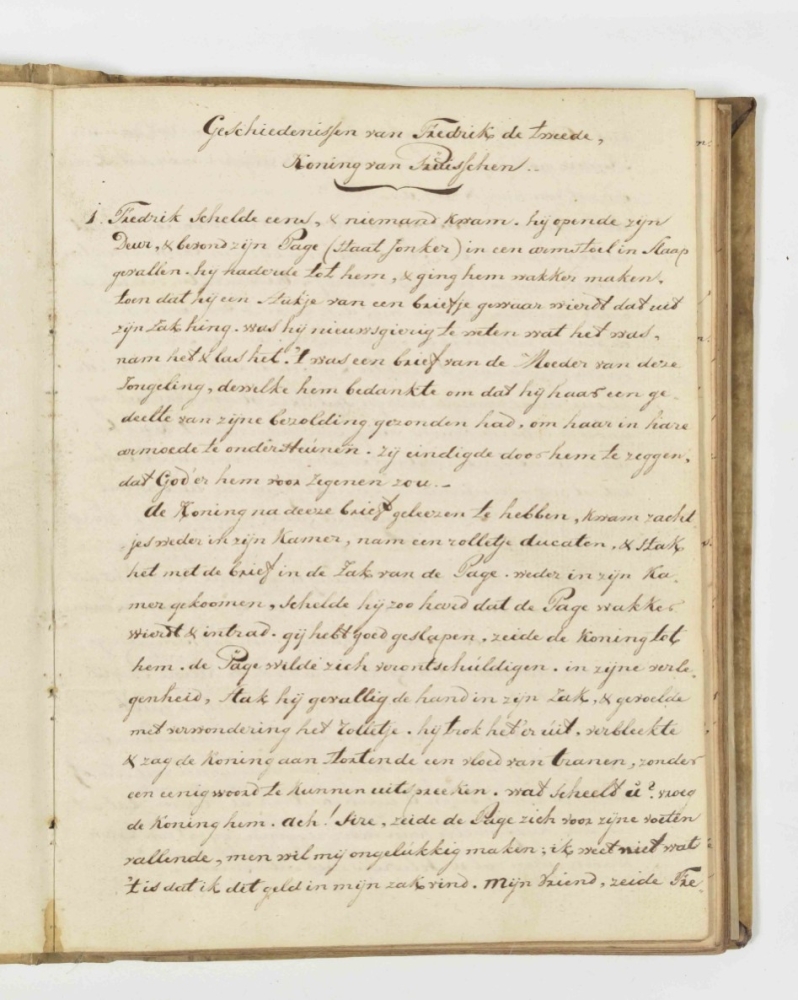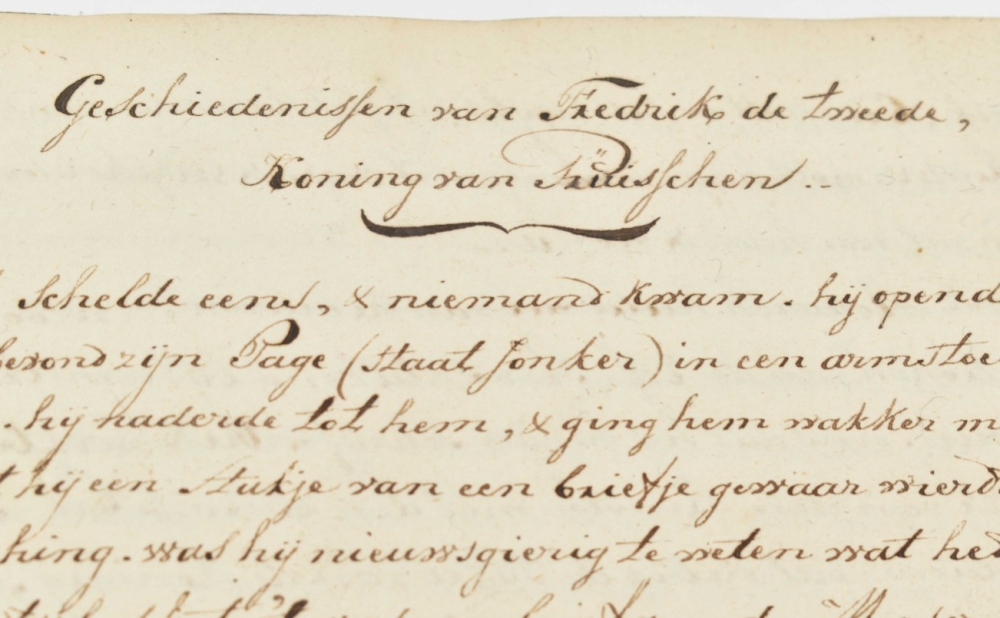 Ink on paper, 19th-century hand. 79 unnumbered leaves. History of the king of Prussia, Frederik II (1712-1786). Contemp. vellum, 4to size.