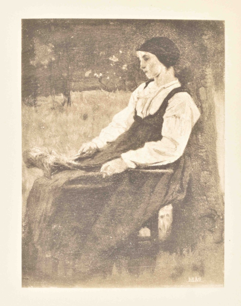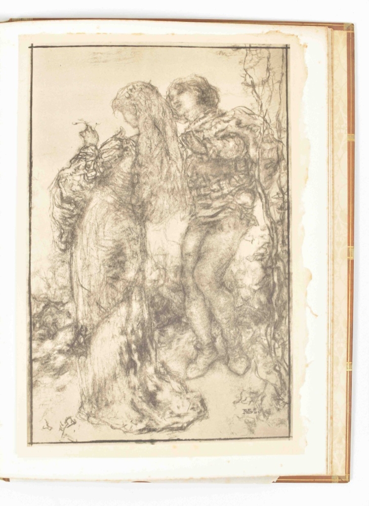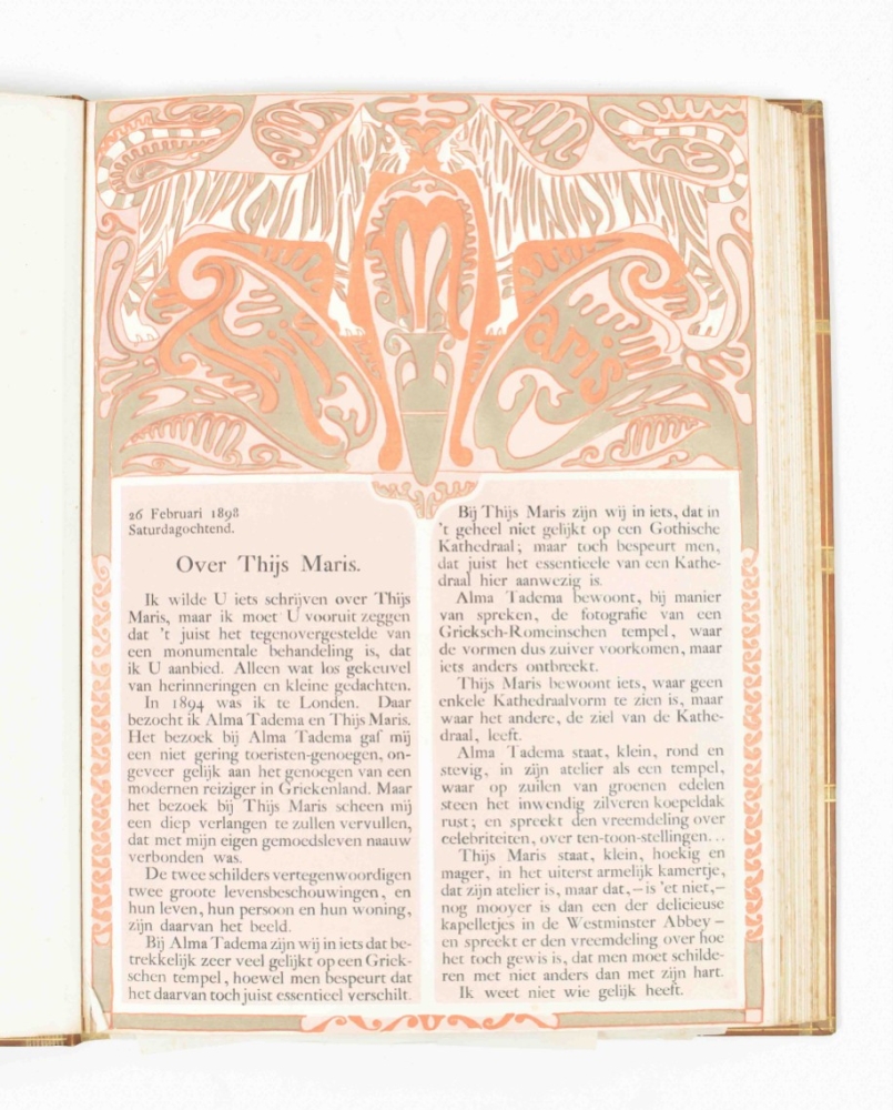 Introduction by L. van Deyssel, dated Febr. 1898 and printed within fine tinted lithogr. borders. N.pl., n.publ., n.d. (Haarlem, H. Kleinmann & Cie, 1900), (8)p., 18 tipped-in helio-engr. plates after Matthijs Maris, bookdecoration and orig. gilt and dec. full vellum by C.A. Lion cachet, folio.