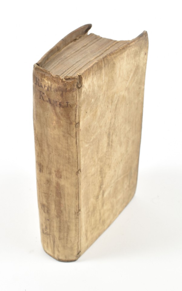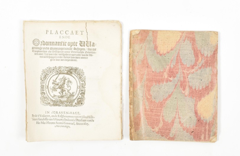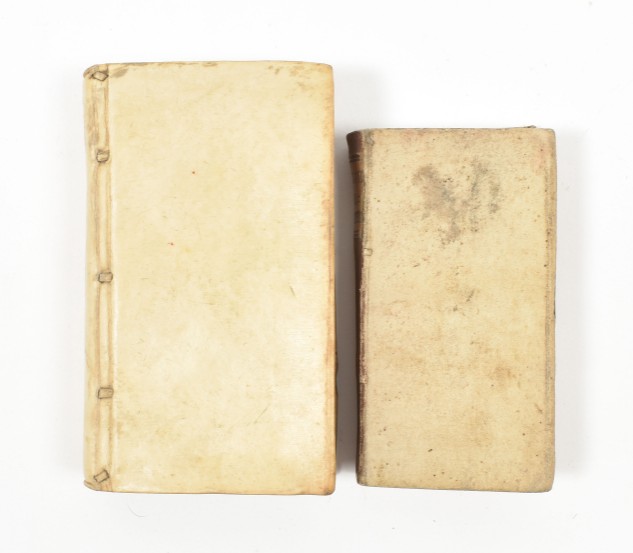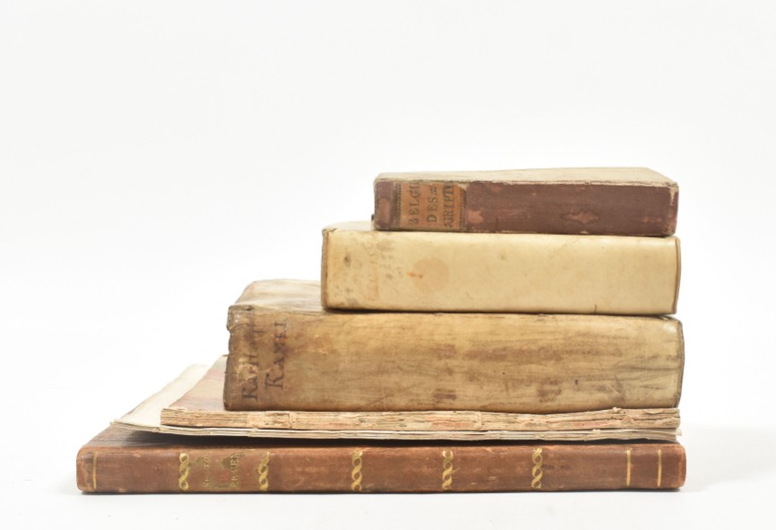 Pastedowns detached from boards, bookblock detached from head- and tailband. Buisman 2392, also listing two more vols. that appeared; Waller 1804 (first vol. only); List of Books coll. by the Tokugawa Shogunate, p. 10 (first vol. only); Gieles-Plak 30, 1; (2) A. Montanus. Korte catechisatie, over de gemeine plaetsen der H. Schriftuer: tot onderwijsing van de Christelijcke jeugd (...)./ Korte catechizatie over den Heidelbergsche catechismus (...). [Both:] Den tweeden druk, seer vermeerdert en verbetert. Printed in Schoonhoven by L. van Hek for M.W. Doornik in Amst., 1659, 2 parts in 1 vol., (6)338,(16); (2),55,(3) pp., contemp. vellum, 12mo (old. annots. at the beginning). Very rare, just a few copies in NCC, apparently only listing this 2nd edition. Van der Haar, Schatkamer, M 312 and M 311 (also 2nd editions only); Burgersdijk & Niermans, Bibl. Theol., 1900, no. 11078. And 4 miscell. others (published in 1625, 1630 (Elzevier), 1659 (by Simon van Leeuwen) and 1792 (letters by Johan Newton to T. Haweis). (total 6 miscell. (rare) titles)