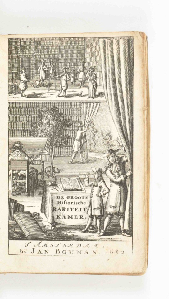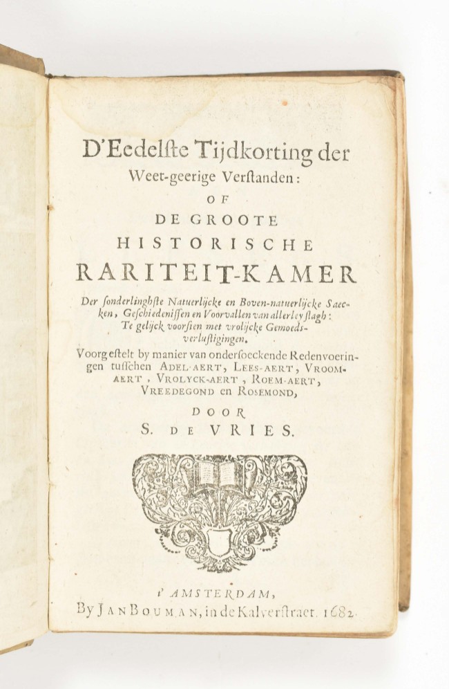 verstanden: of De groote historische rariteit-kamer der sonderlighste natuerlijcke en boven-natuerlijcke saecken, geschiedenissen en voorvallen van allerley slagh: te gelijck voorsien met vrolijcke gemoeds-verlustigingen (...). Amst., J. Bouman, 1682, (16),608,(48) pp., w. engr. frontisp. and portrait of the author, contemp. vellum.