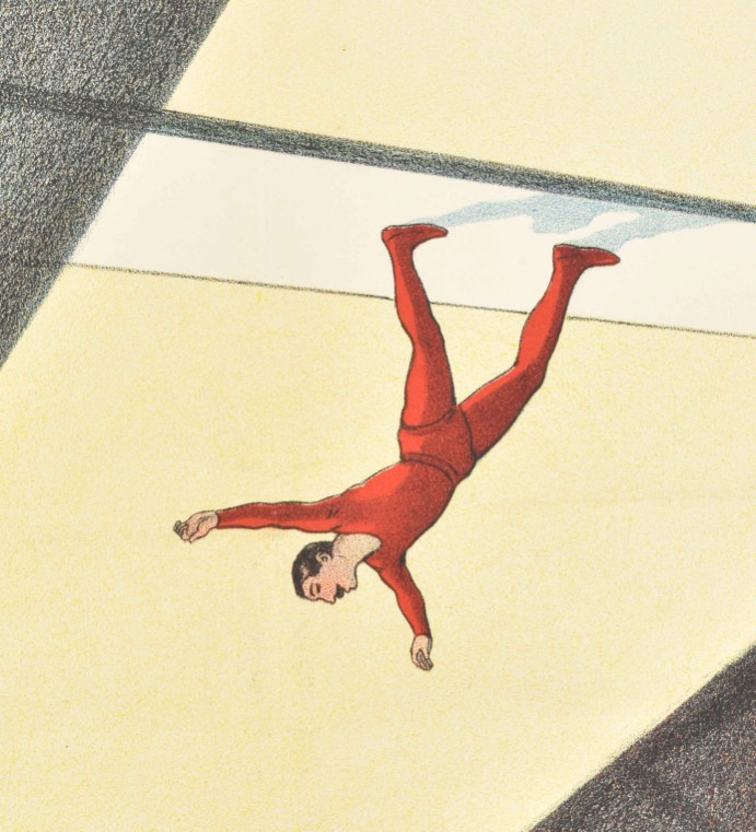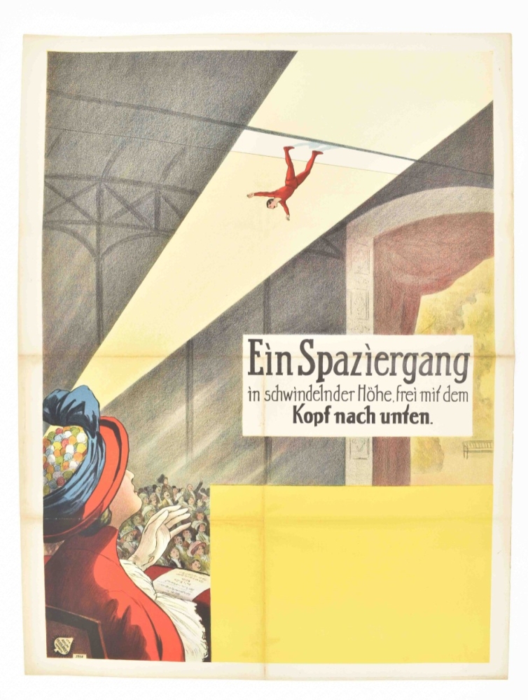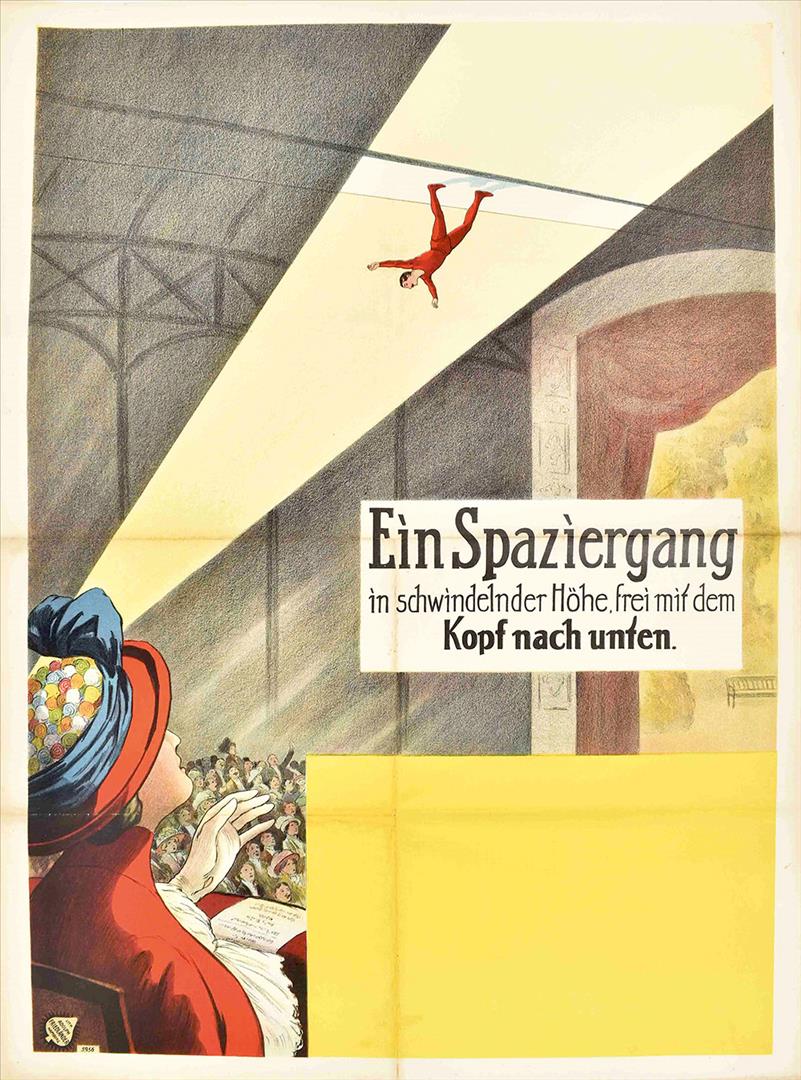 Im Circus Bekentow. Ein Spazierung in schwindelnder Höhe, frei mit dem Kopf nach unten. Friedländer, Hamburg, 1913. 96 x 71 cm. Lith. no. 5956.