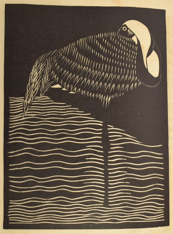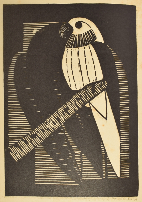 A. van der Boom, J.A.A.M. van Es, Wassenaar, 1928. Small folio, sewn. Front board original woodcut of an owl (no. 1), another 2 original woodcuts, no. 2 on p. 4, parakeet and no. 3 on p. 16, white-naped crane. Woodcuts and reproductions all under blotters, 46 pp. Spine with some staining, occ. foxing, else in good condition.