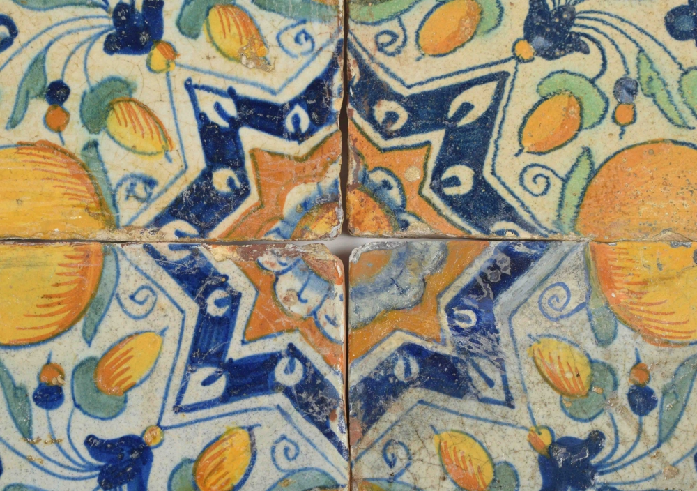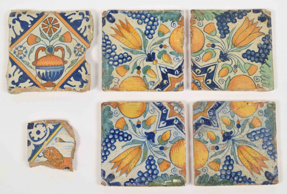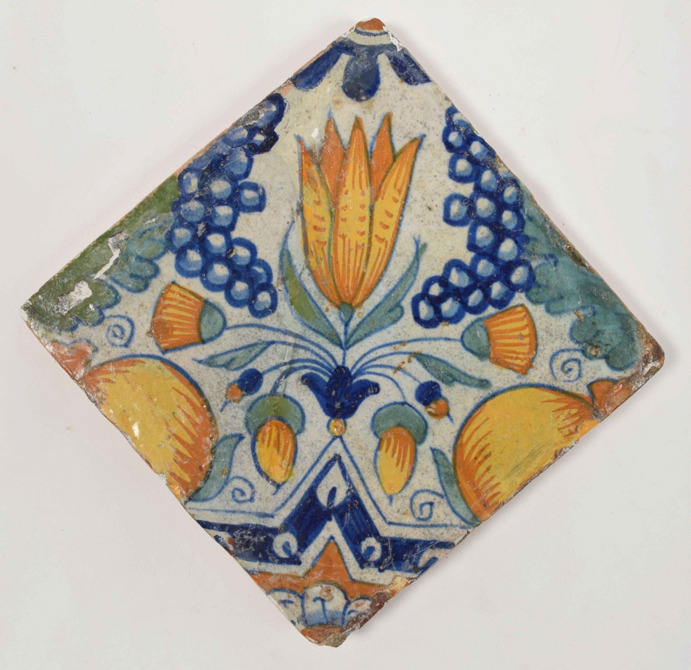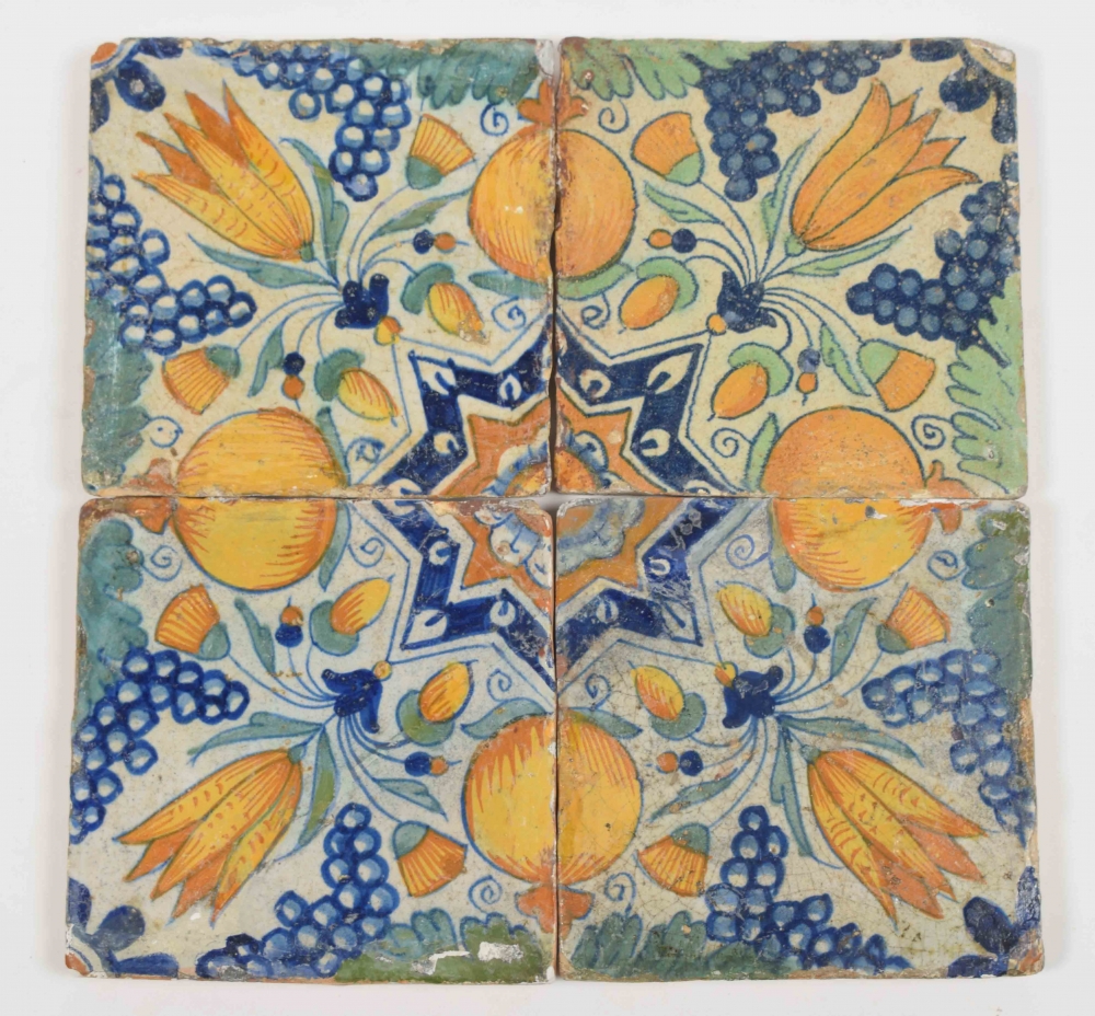 Tile tableau of four tiles with polychrome decor depicting pomegranates. With restorations + square tile - and a fragment. 17th century.