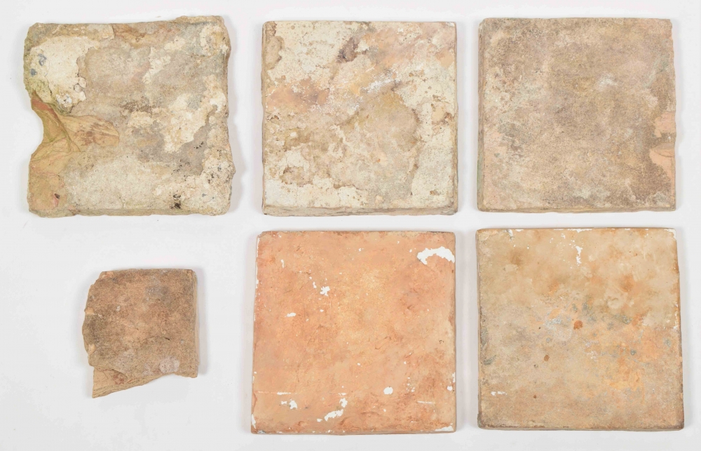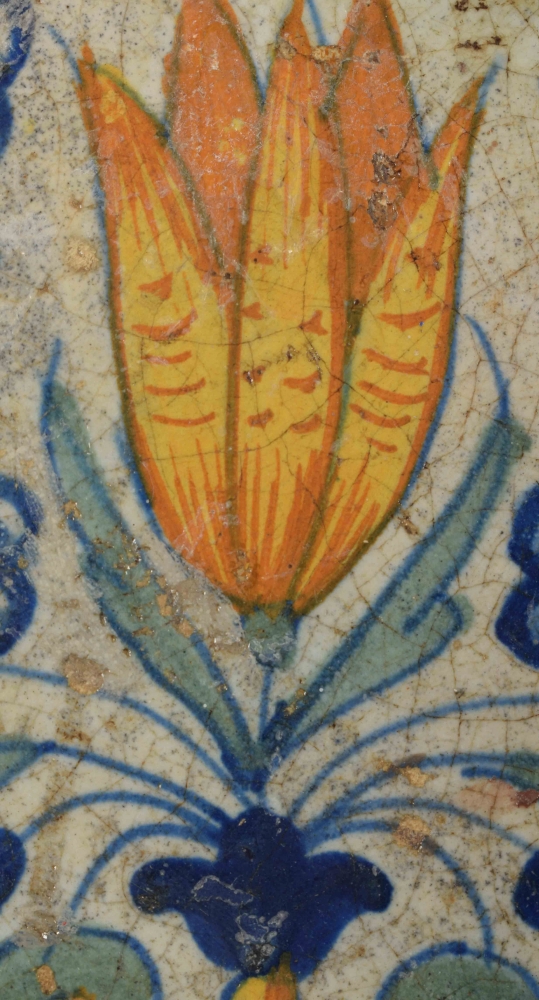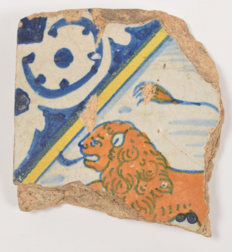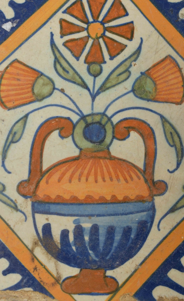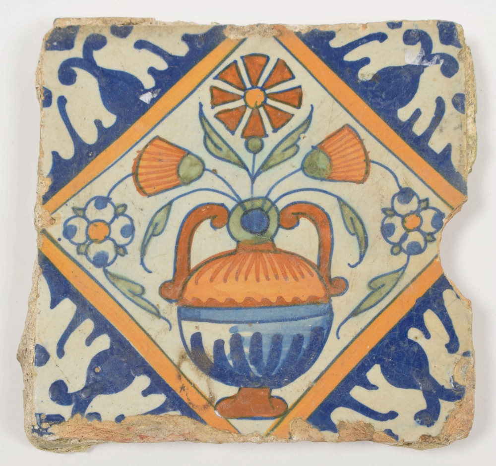 Tile tableau of four tiles with polychrome decor depicting pomegranates. With restorations + square tile - and a fragment. 17th century.
