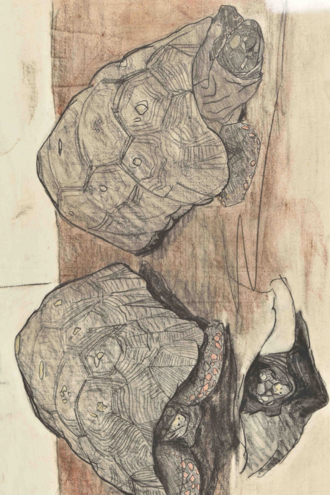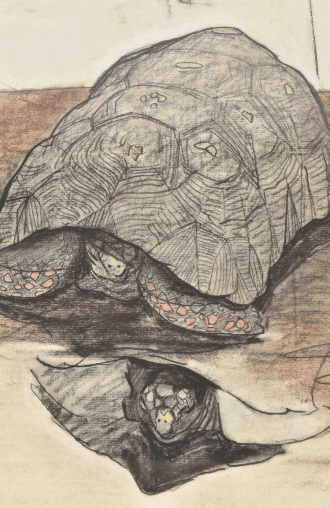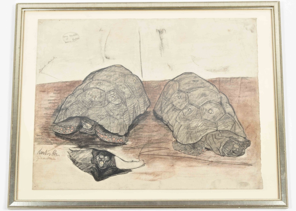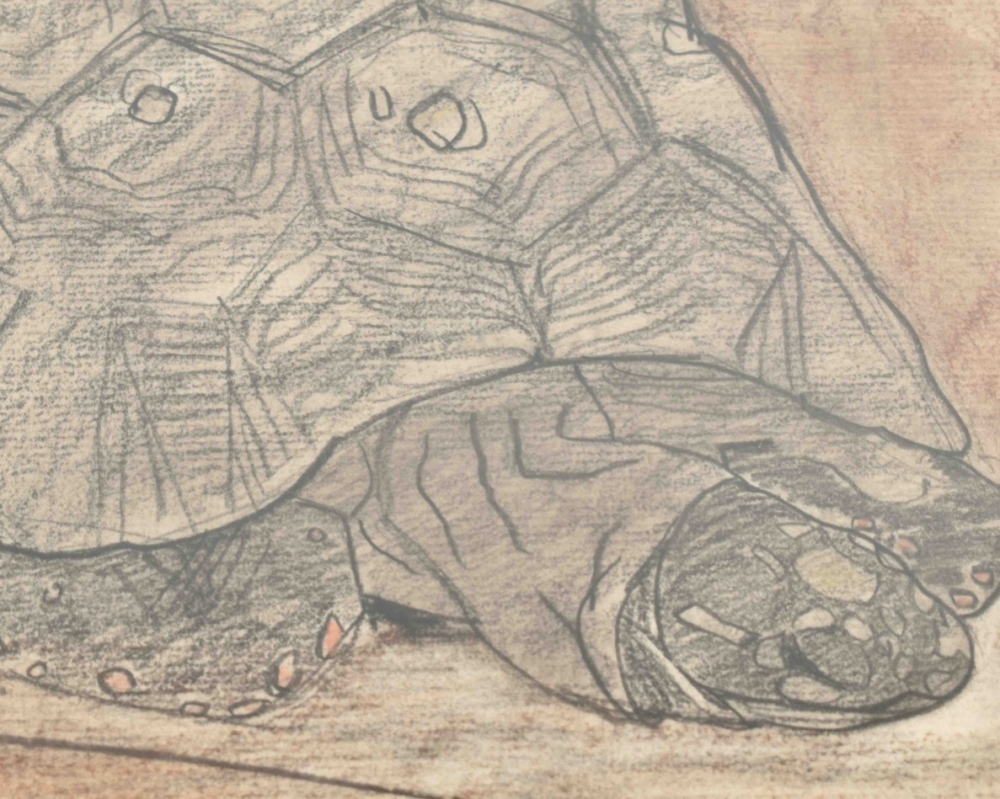 Two Turtles. Chalk on paper, undated (c. 1910-1930. Tipped on thin cardboard. 44 x 54 cm. Framed (52 x 66 cm). W. annotations from the artist's hand.