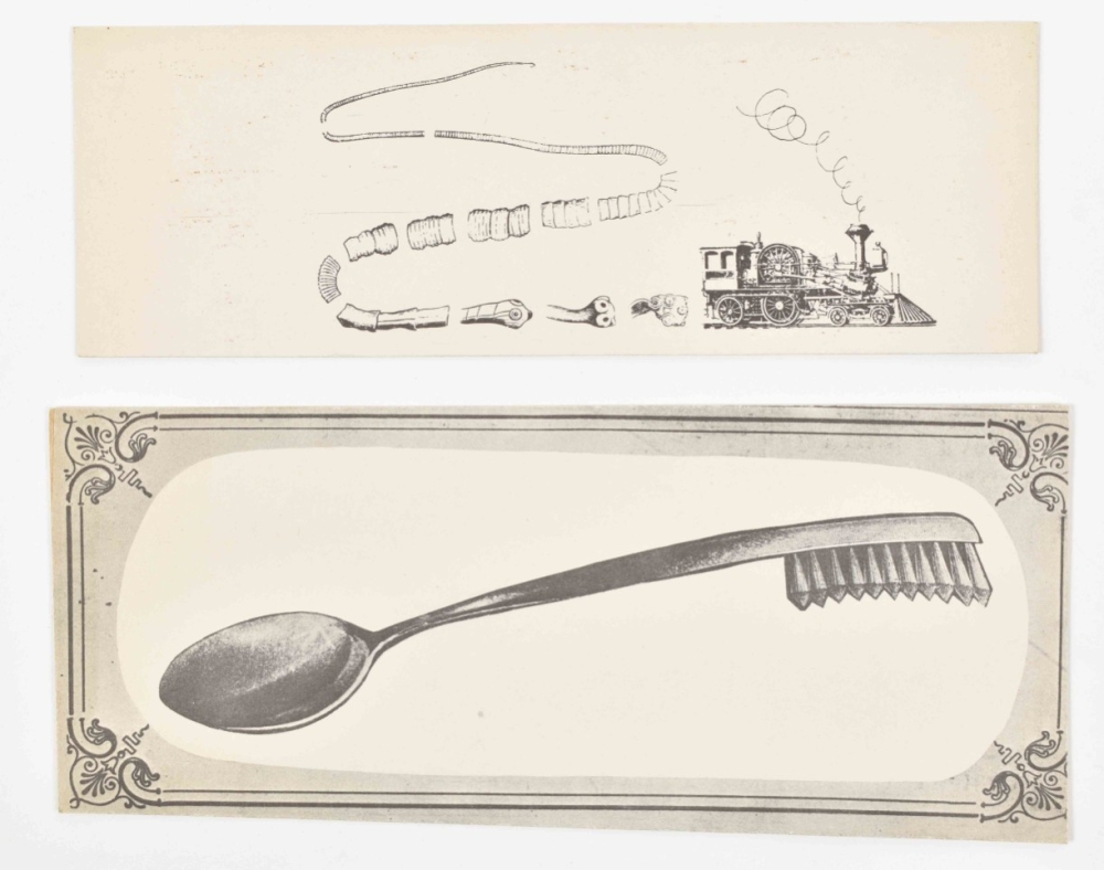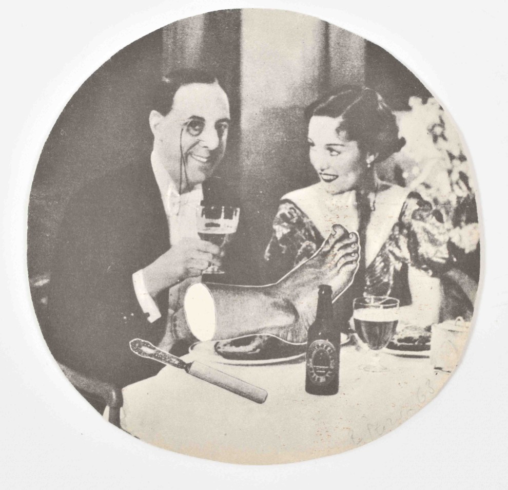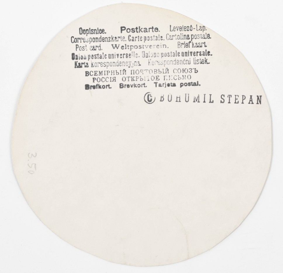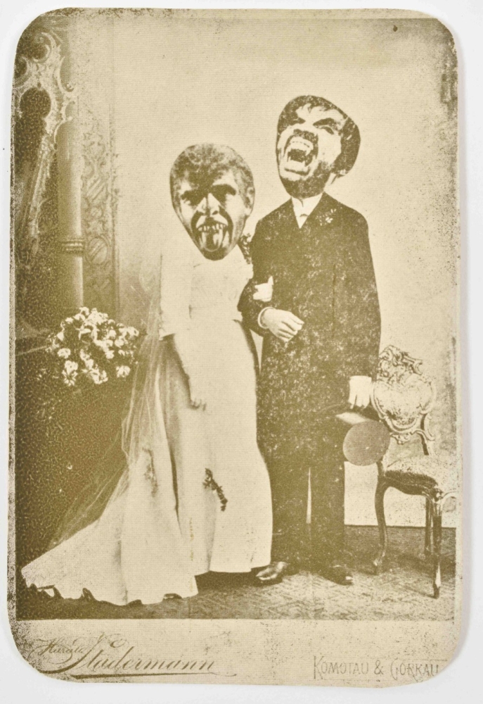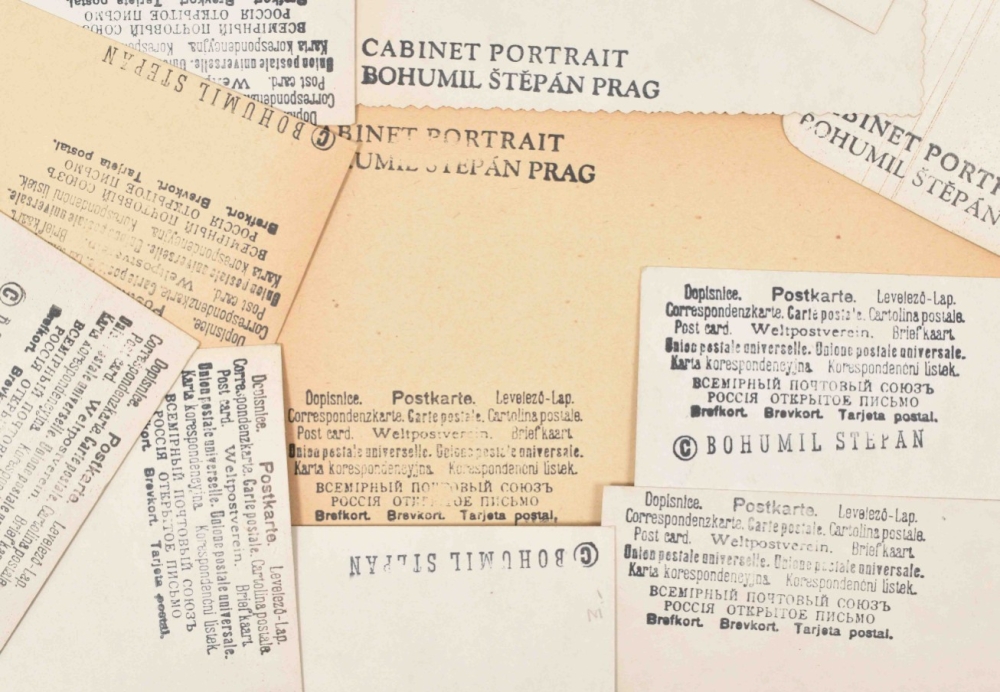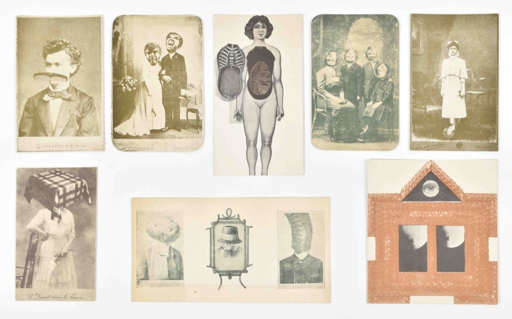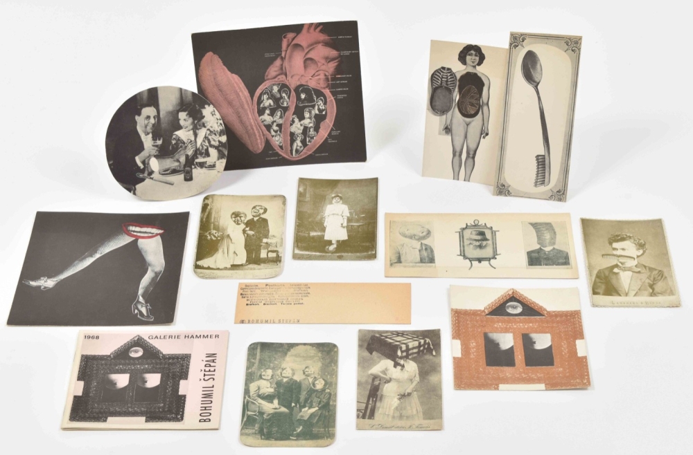 Fun collection of ephemera from Czech painter, graphic artist and illustrator. 8 printed photo collage postcards of various sizes (from 19 x 20 cm to 15 x 10 cm) and 5 satirical photo collage postcards using 19th century cdv portraits. Stamped on the back with the artist's name and 'postcard' in several languages plus additional information such as 'Cabinet Portrait'. Probably made in the late 60s.