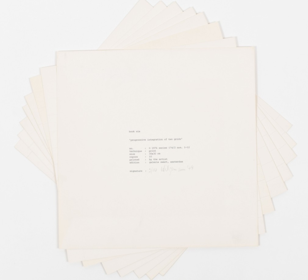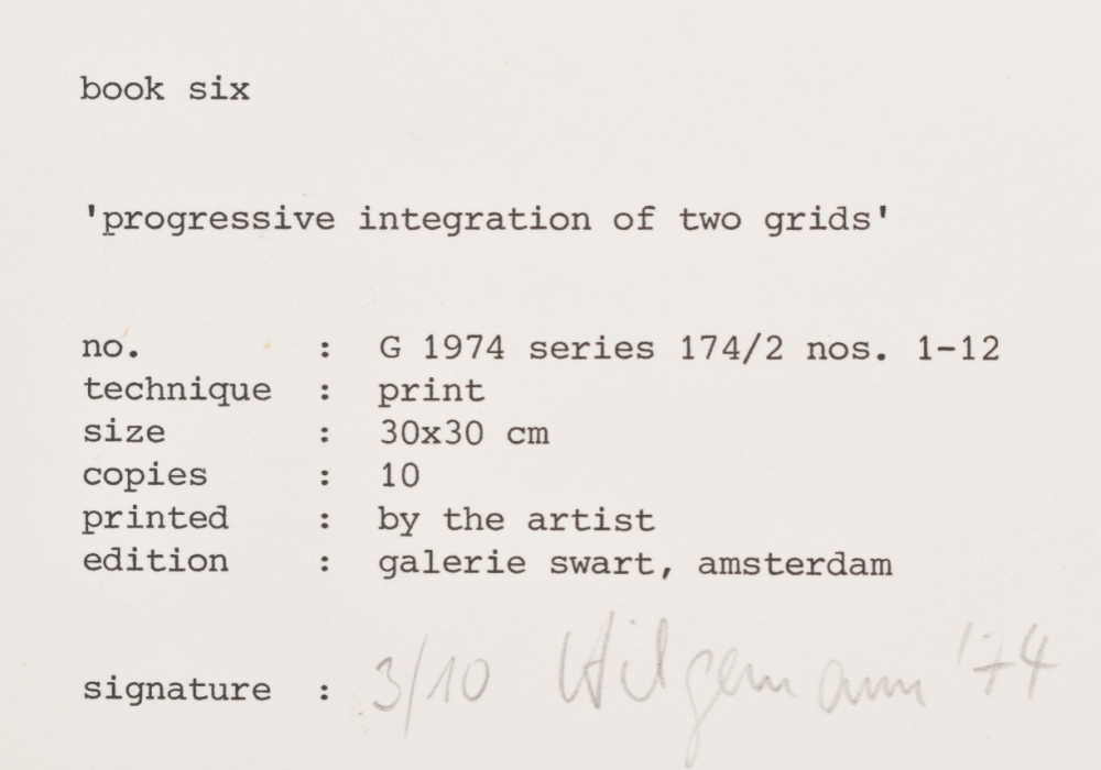 Amsterdam, Galerie Swart, 1974. No. G 1974 series 174/2 nos.1-12. Blank stiff paper portfolio, 30 x 30 cm, containing all 12 blind stamped cardboard sheets, printed by the artist. Edition of 10 copies. Title-leaf signed 'Hilgemann', numbered '3/10' and dated '74' in pencil. Portfolio as well as prints in fine condition.