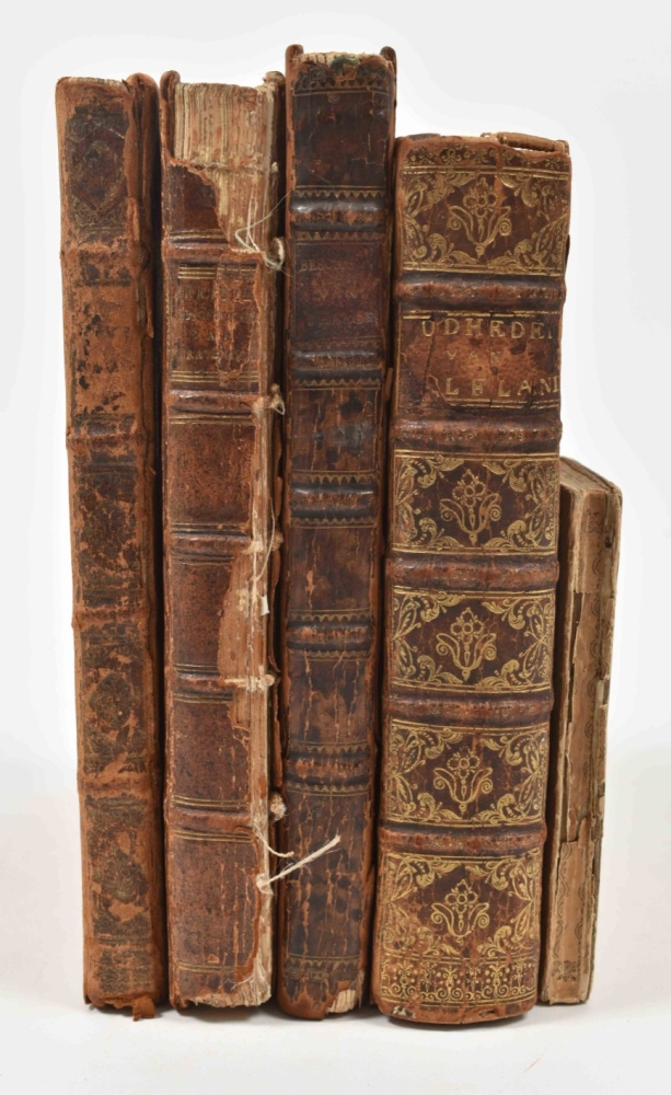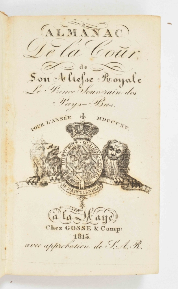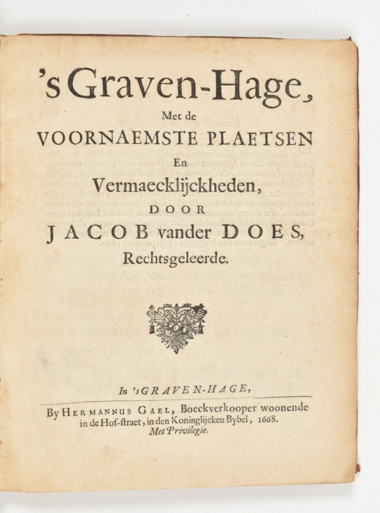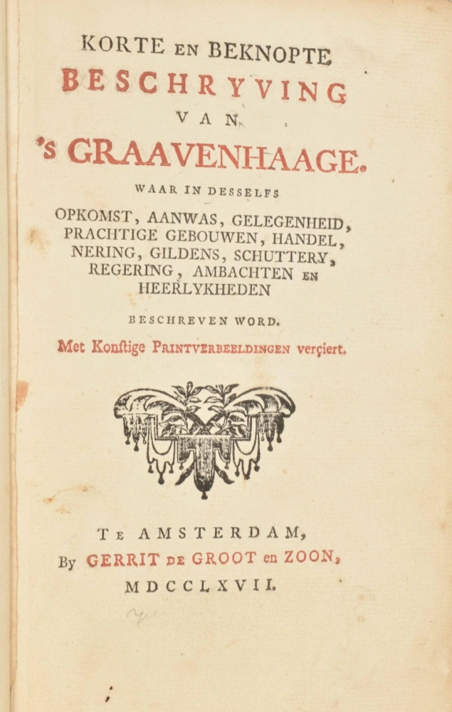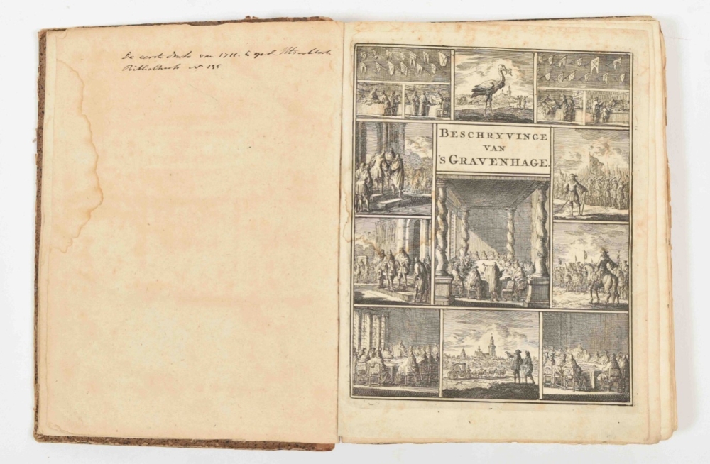 mitsgaders van 's-Gravenhage. Uyt het Latijn vertaald, en met aantekeningen opgehelderd, door H.V.R. Leiden, Christiaan Vermey, 1720. x, cxxvii, 506, xiv pp. W. 7 fold. plates. Calf, spine w. gilt lettering and ornaments. 8vo. Dam. to spine, worn, corners bumped, browned, name stamp on title + Korte en beknopte beschryving van 's-Gravenhage (...). Amsterdam, Gerrit de Groot, 1767. 157 pp., 8vo. Half calf. W. fold. plate. Upper board loose + 's-Gravenhage met de voornaemste plaetsen (...). Jacob van der Does. The Hague, H. Gael, 1668. 143 pp. Calf. Lacks map. Upper hinge dam., last lf. dam. + Beschryvinge van 's-Gravenhage (...). Gysbert de Cretser. Amsterdam, Ratelband, 1719. 2e dr. Half calf. Upper board loose, spine dam. and other defects.