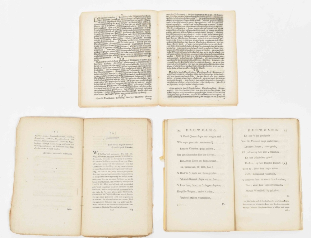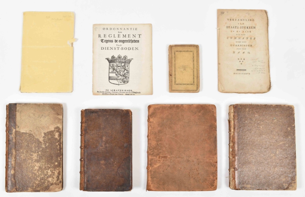 And: Ordonnantie ende reglement jegens de ongerechtheden der dienstboden. The Hague, Scheltus, 1679. 4 leaves. Orig. paper wrapper, 4to + Het verneedert en verheerlyckt 's-Gravenhage. Eeuwzang. L.E. Francq van Berkhey. Amsterdam, 1776 - and 2 more. (total 8)