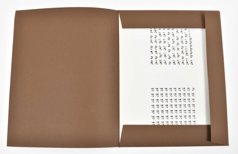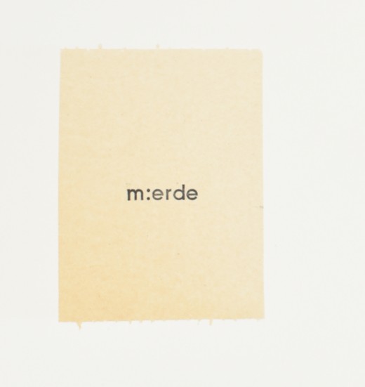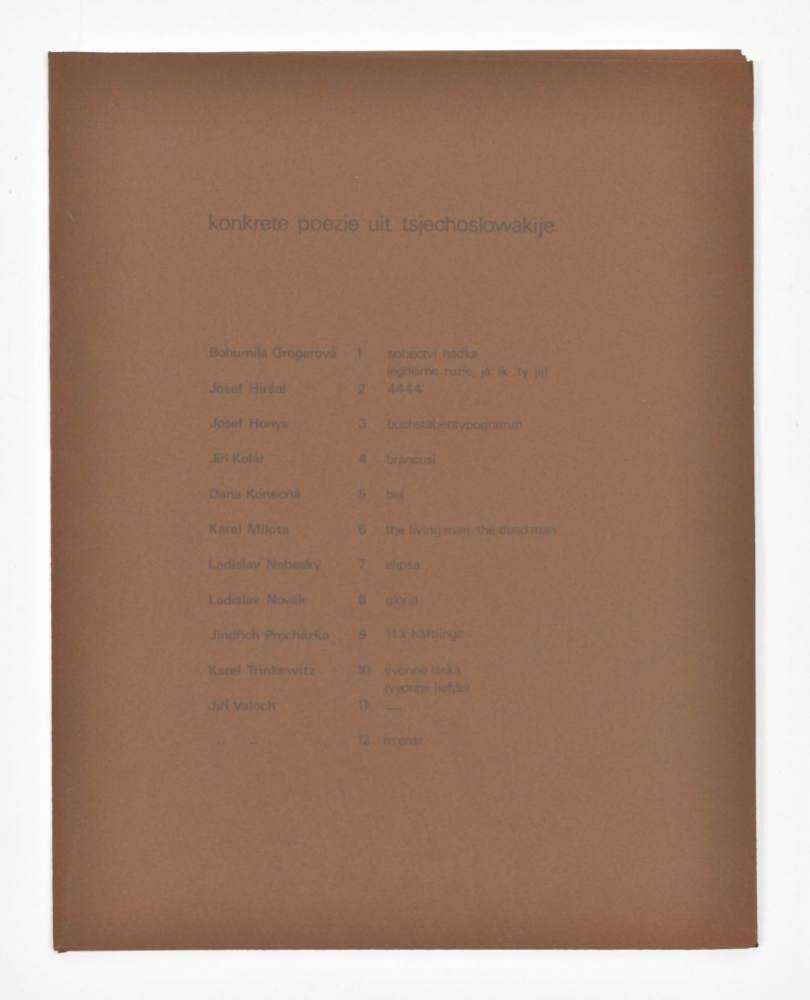Amsterdam, nd (1970). Tall dark brown paper portfolio 28.2 x 35.5 cm with eleven silkscreens and a single sheet of toilet paper stamped M:erde. Concrete poetry collection by Czech poets and artists published in Amsterdam during the Communist Party rule in Czechoslovakia.
