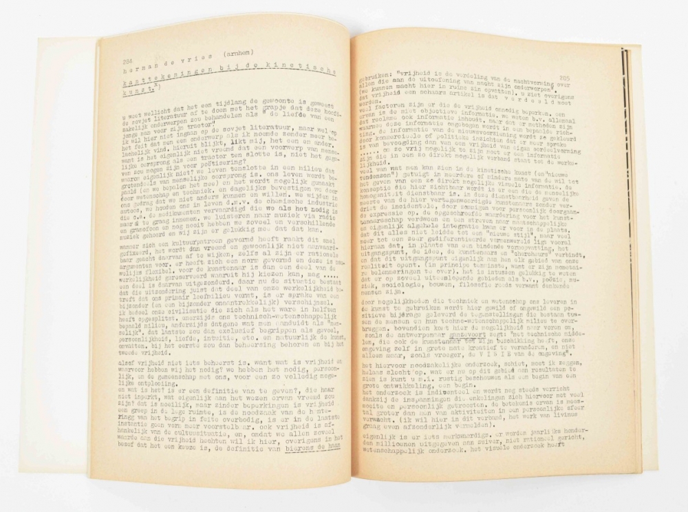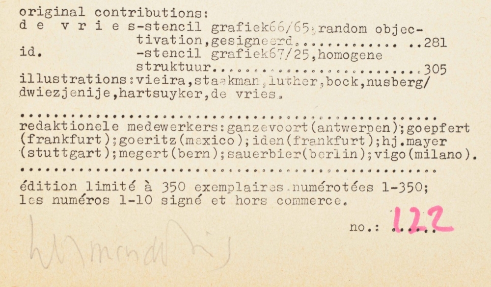 Edition 227/350, signed in pencil by de vries on first page. 30 x 21.5 cm, 87 p. Contributions by: Staakman; Nusberg/Dwiezjenije; de vries; Vieira; Houédard (Op poems in dots); Sharkey (Concrete poem); Deman; Aubertin (L'art dans la société capitaliste), a.o. Exquisite, rare and signed copy. Added: (2) herman de vries Werken 1954-1980. Groningen, Groninger Museum, 1980. Softcover, glassine dustwrappers with a dry tree leaf pressing, loose as issued. 29.5 x 21 cm, 206 p. Text in Dutch and German with plates in b/w, list of works and bio/bibliographic information. Print run of 1.000. Very fine copy.