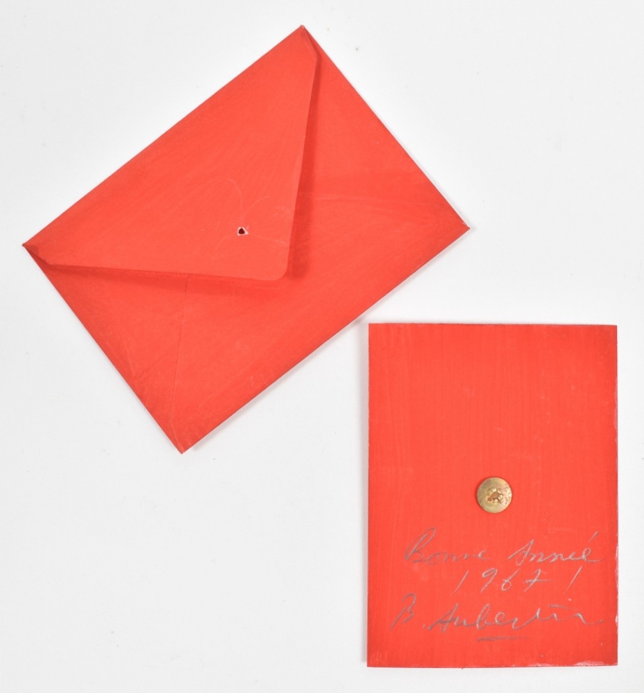 Marvelllous all red tiny artwork by Bernard Aubertin consisting of red painted envelope (7 x 10 cm) housing a mini painting with red square and thumbtack. In original (white) envelope addressed to TD, 1966.