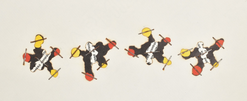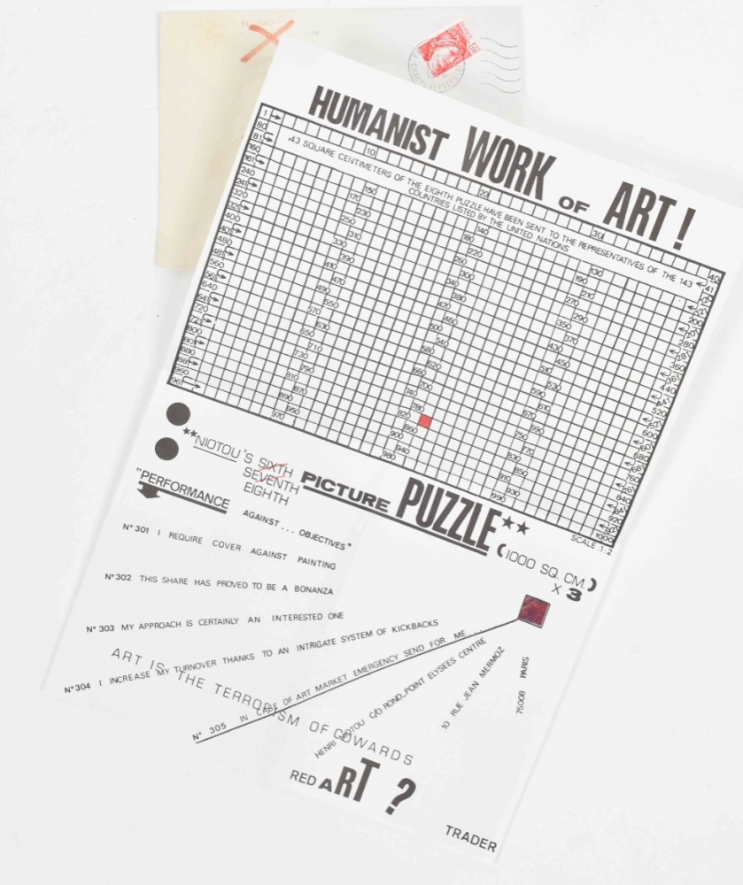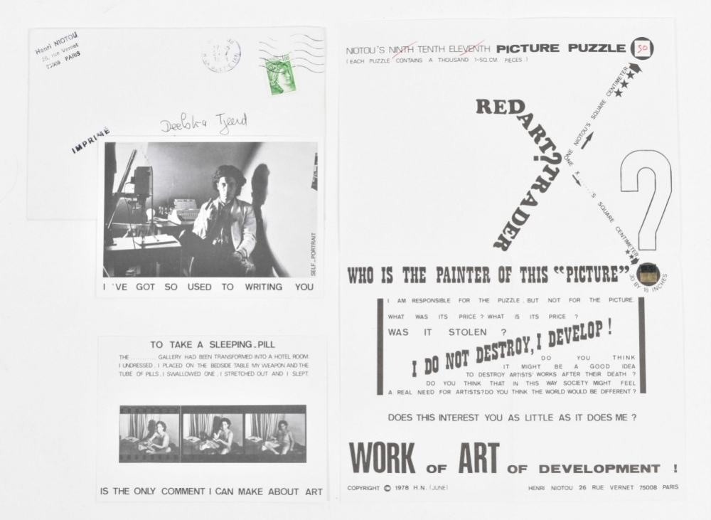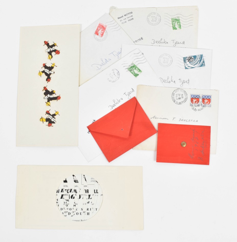 + 2 collaged works by the Czech poet and visual artist Karel Adamus, 1970. Includes a signature 'Cigarette Poem' from 1970 consisting of an envelope with burned holes, staples and printed inserts. Both works signed and dated. + Four envelopes addressed to TD filled with 'Picture Puzzle' works by French artist Henri Niotou, A4 printed sheets, hand numbered and collaged, plus 2 postcards, 1978-79. In envelope to TD.