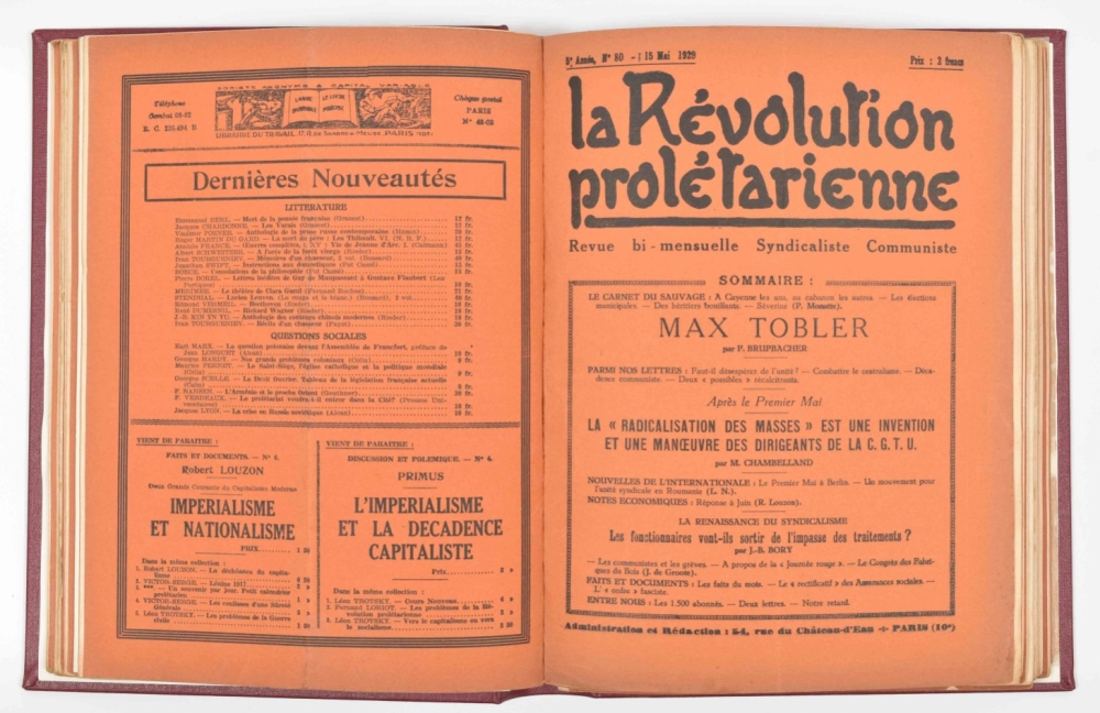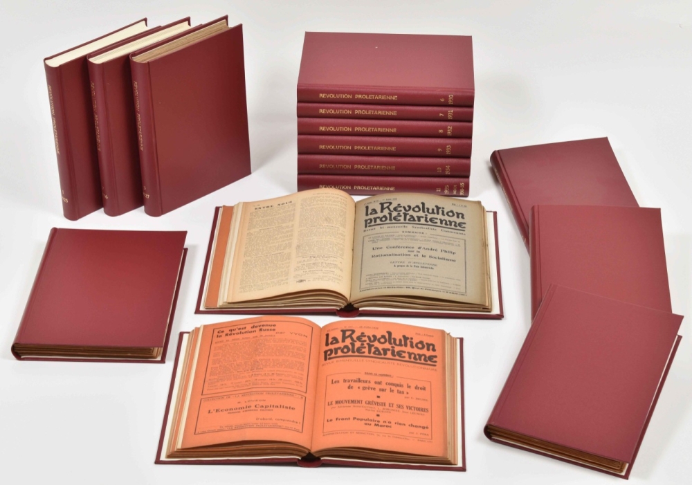 Revue bimensuelle syndicaliste communiste. Paris, 1925-1939. Year 1-15, containing nos. 1-301. Red cloth, most bound in orig. red wrappers. With contributions of a.o. Victor Serge, Maurice Chamelland, Rosa Luxembourg, George Orwell and L. Trotzky.