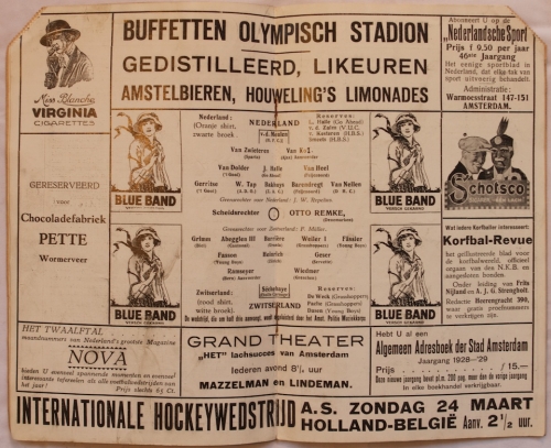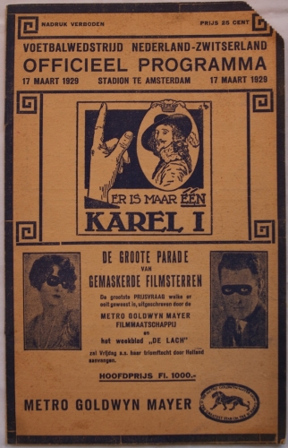 Programme March 17, 1929, Amsterdam stadium. 20 p. Tearstrips upper right corner neatly removed. Good copy.