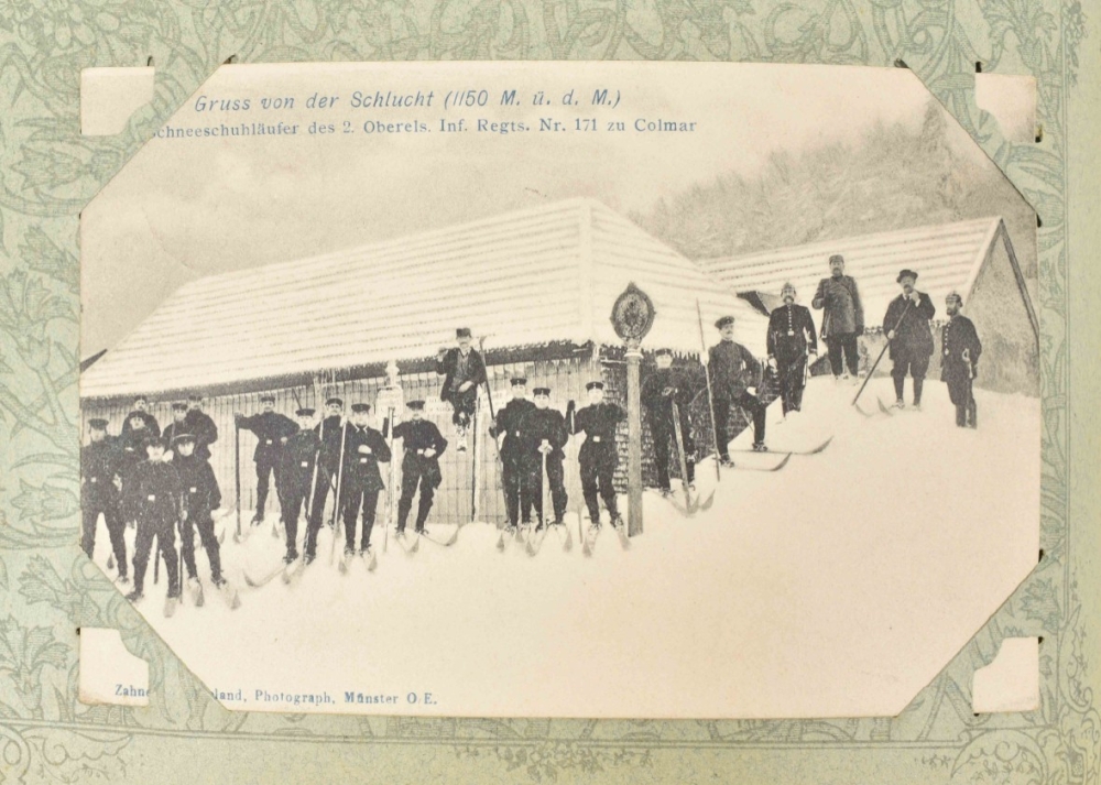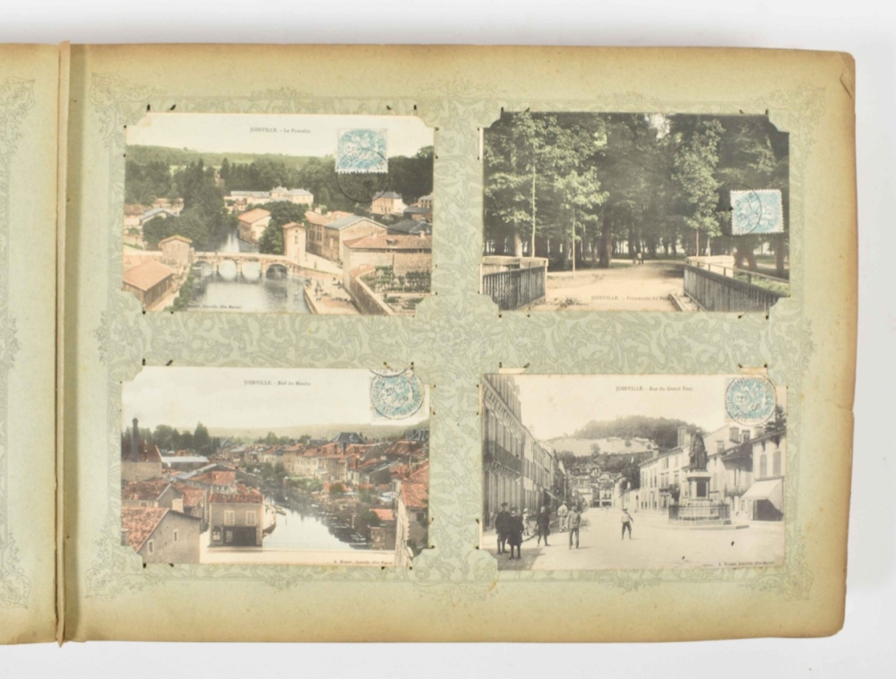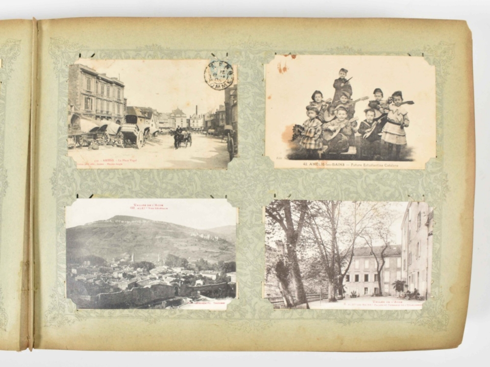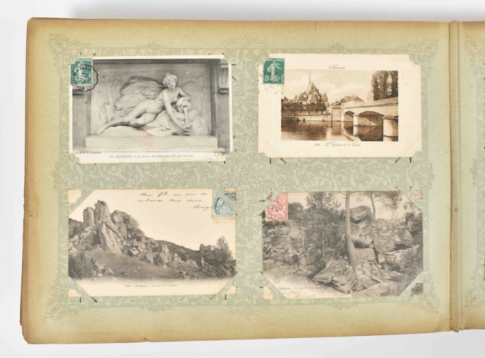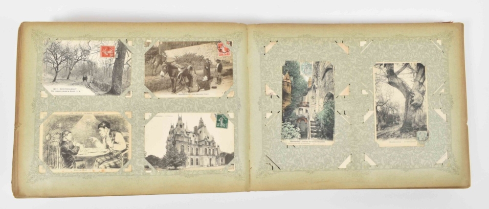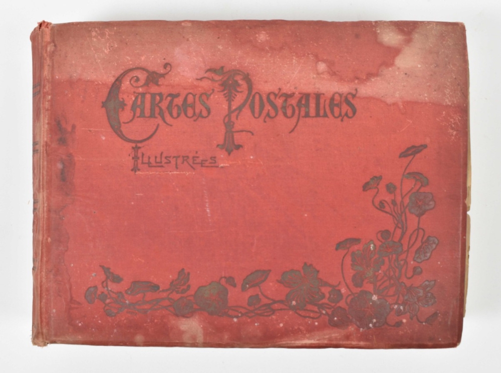 Mainly French cards, c. 1900-1910. Most cards circulated. In large oblong album (28 x 27 x 10 cm). Cloth, binding worn and soiled.