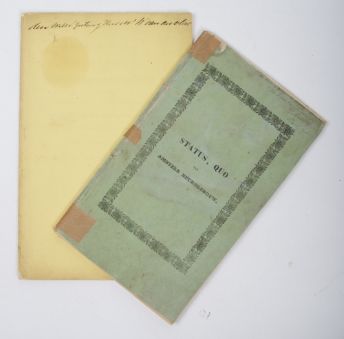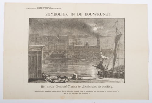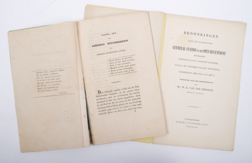 Amsterdam, J.C. van kesteren, 1840. 79 p. Spine dam., yet complete. + Bedenkingen tegen het staatsontwerp Centraal-Station in het Open Havenfront mitsgaders Ontwerp-station Leidsche barriere (..) Erven H. van Muster & Zoon, Amsterdam, ca. 1880. 16 p. Incl. the print of the new Central Station of Amsterdam (under construction) taken from the weekly magazine for the Netherlands no. 382.