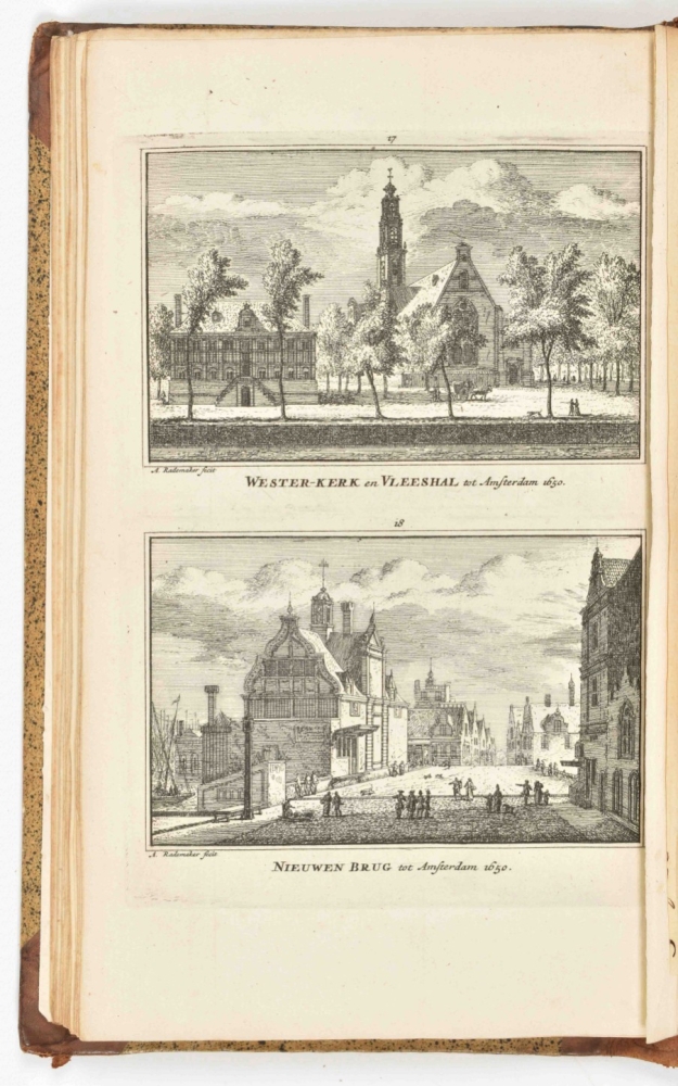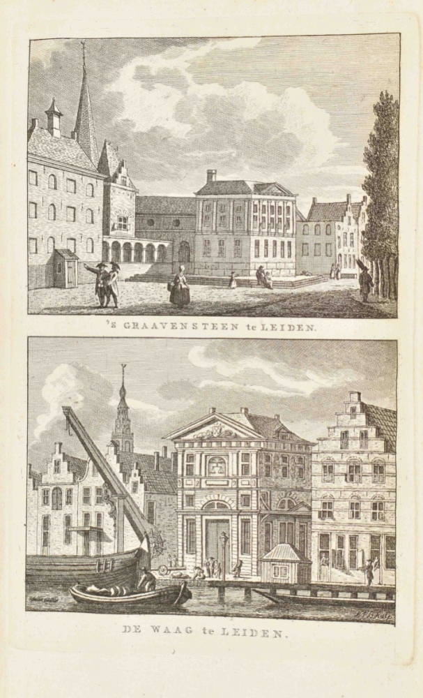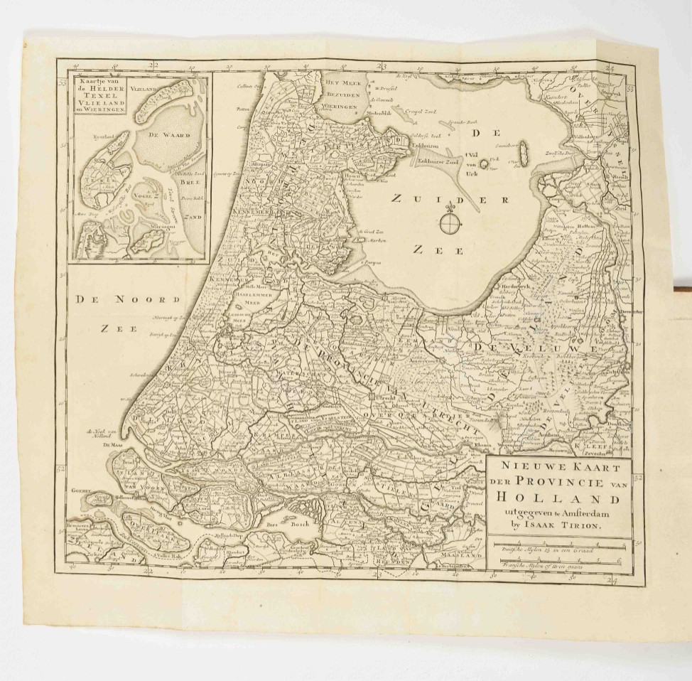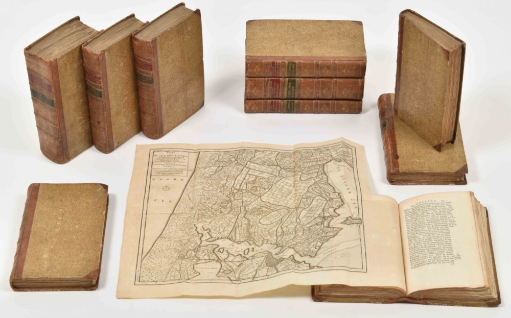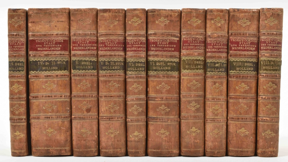 Parts 4-8, each in 2 vols. Amsterdam, 1742-1750. Half leather, titles on spine with red, green and gilt stamping, uniformly bound, 5x frontispiece with caption by J.C. Philips, 5x title with vignette, several divisional titles. 5 consecutive parts of Tegenwoordige staat; Holland complete. 12 engraved maps, 24 engraved plans and 15 engravings by J.C. Philips after drawings by Pronk, De Beyer and others, mostly folding. Very good set.