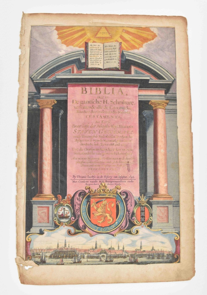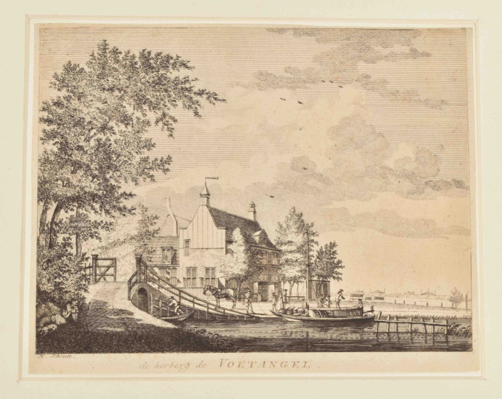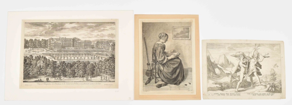 Includes a.o.: 1) A splendidly handcol. and richly heightened w. gold title-page of the Amsterdam 1643 folio edition of the Statenbijbel (a few defects, but clearly executed by a professional "afsetter" like Dirk Jansz. van Santen); 2) H. Schoute (2nd half 18th cent.). "De herberg de Voetangel". Etching and engraving, 14 x 18 cm, signed in the plate, under passepartout. Trimmed inside the platemark. Rare view of the still existing inn "De Voetangel" (the "Mantrap", built in 1627 as toll booth) in Ouderkerk aan de Amstel; 3) Pieter de Mare (1758-1796). (Lacemaker). Etching after Abraham Delfos (1731-1820), 23 x 16.5 cm, mounted at upper margin. Nice print of a seated women that is busy with "kantklossen", with a print of Caspar Netscher dated 1664 hanging on the wall behind her; 4) Jan van der Meer de Jonge (1665-1705) (after). (Landscape). Etching by A. de H. (?), 23 x 18 cm, early 19th cent., mounted at upper margin; 5) Adam Perelle (1638-1695). "Veüe et perspective de Chasteau et du Canal de St. Clou noevellement achevé de bâtir." Engr. view in optica style, 21 x 30.5 cm, published by N.D. Poilly, under passepartout; 6) Hendrik Goltzius (1558-1617) (after). (Daphne turning into a laurel tree while being pursued by Apollo). Engraving, 17.5 x 25 cm, with 4-line engraved verse and numbered twice "14" in the plate below the image; 7) Antonie Lodewijk Koster (1859-1937). "De Amsterdamsche Poort te Haarlem". Etching on chine-collé, 25.5 x 16.5 cm, signed in the plate. (total ca. 70)