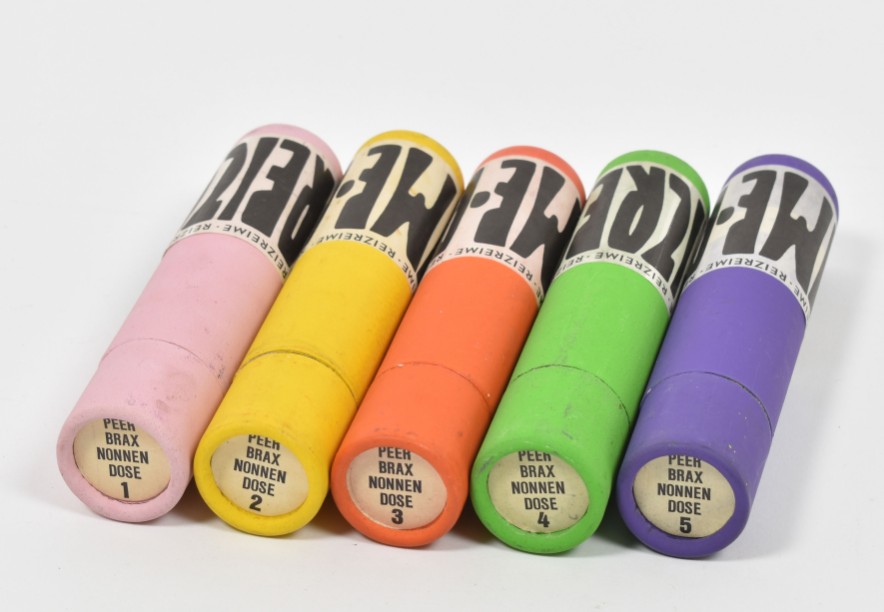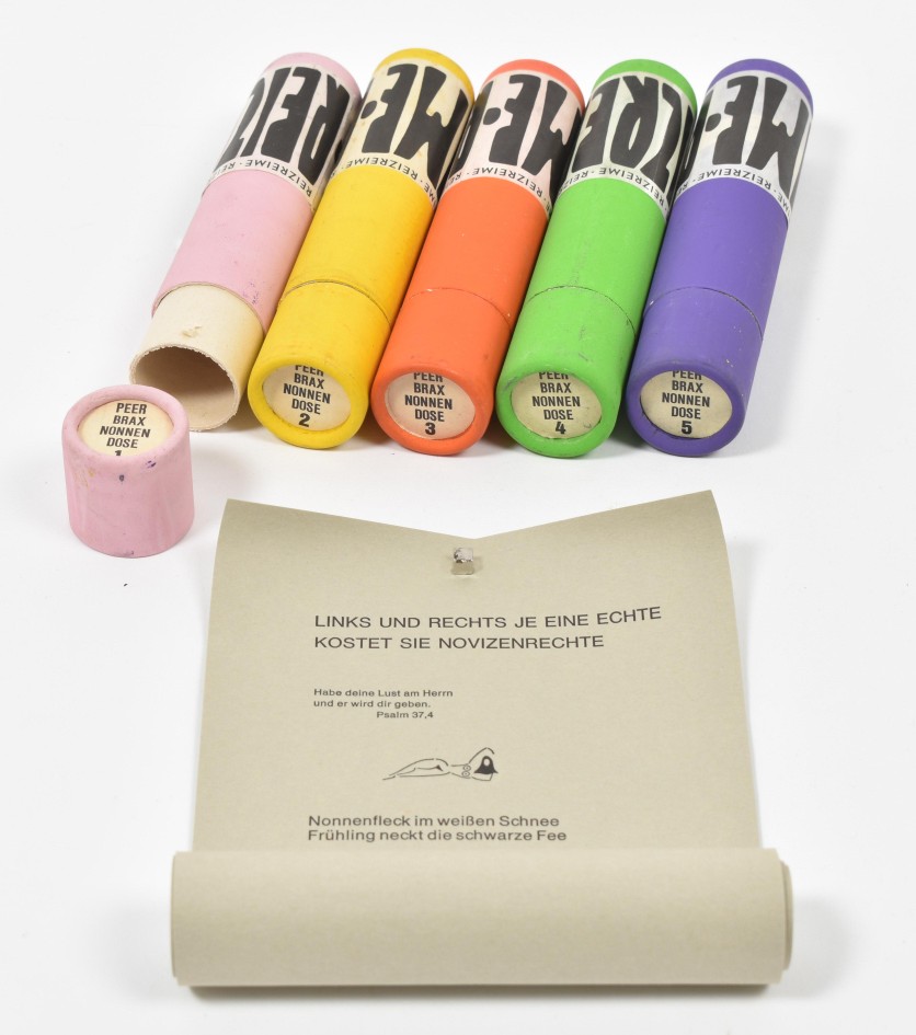 Envelope containing multiples by artist/activist Uwe Wandrey produced by his publishing house Quer-Verlag in Hamburg, 1968-1967. Includes a sticker roll and 6 envelopes with stamped slogans against the war on Vietnam and anti Bild magazine, 5 printed rolls in cardboard holders from the series 'Reizreime' with provocative poems featuring nuns, a Boycot Springer badge and post stamp sheet.