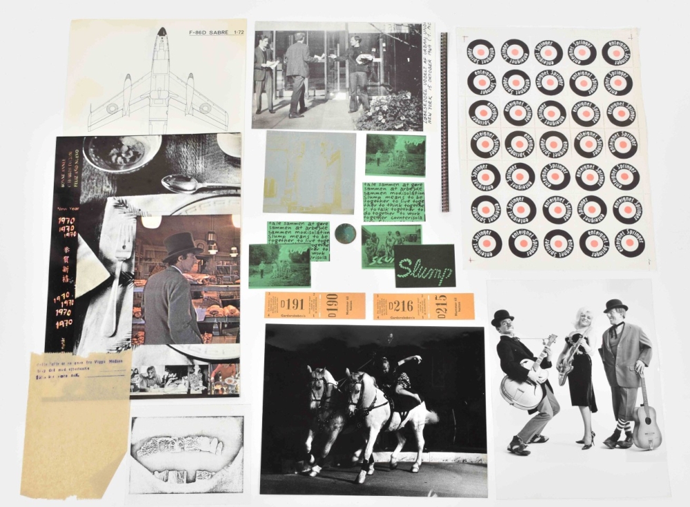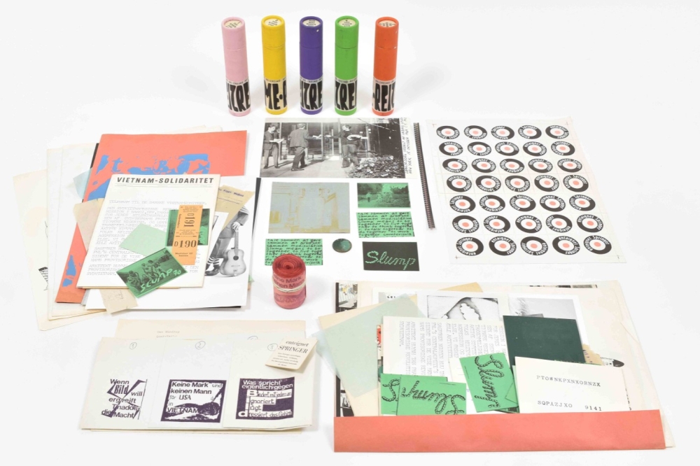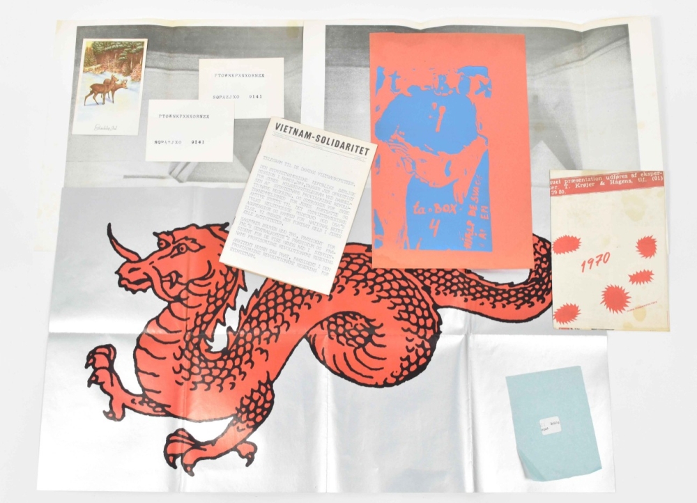 Also holds a letter to Deelstra and a publishers' list + Two collections of approx. 40 unidentified Danish artists' flyers and small multiples from 1970 in plastic cover, including a coin, filmstrip, silkscreen on metal and a booklet from the anti Vietnam war committee, Vietnam solidaritet No. 7, November 1969. (total 14)
