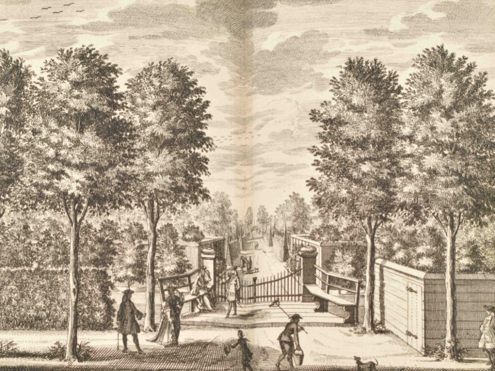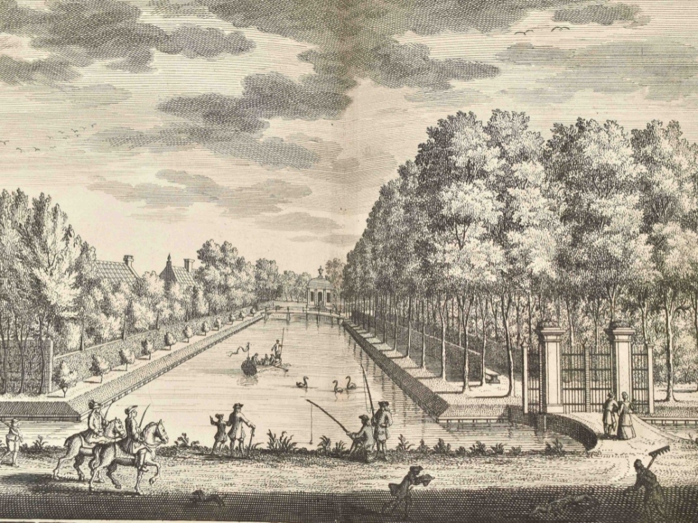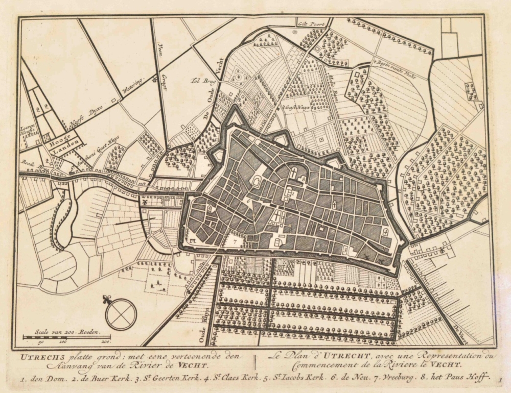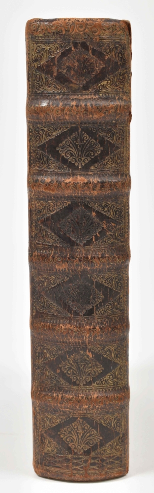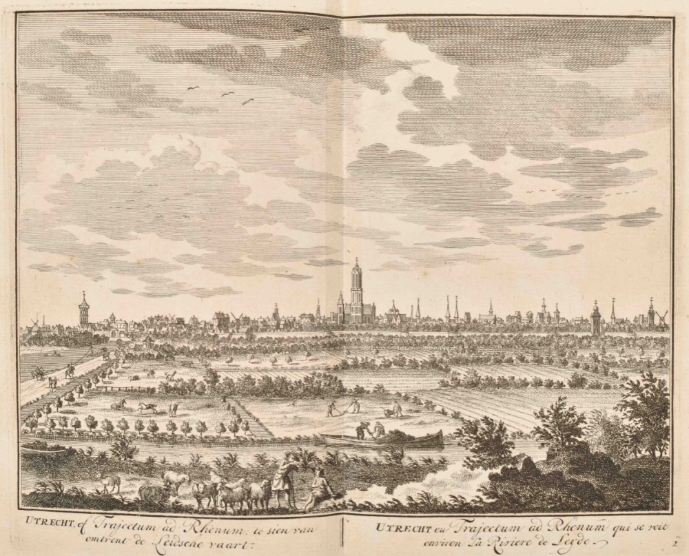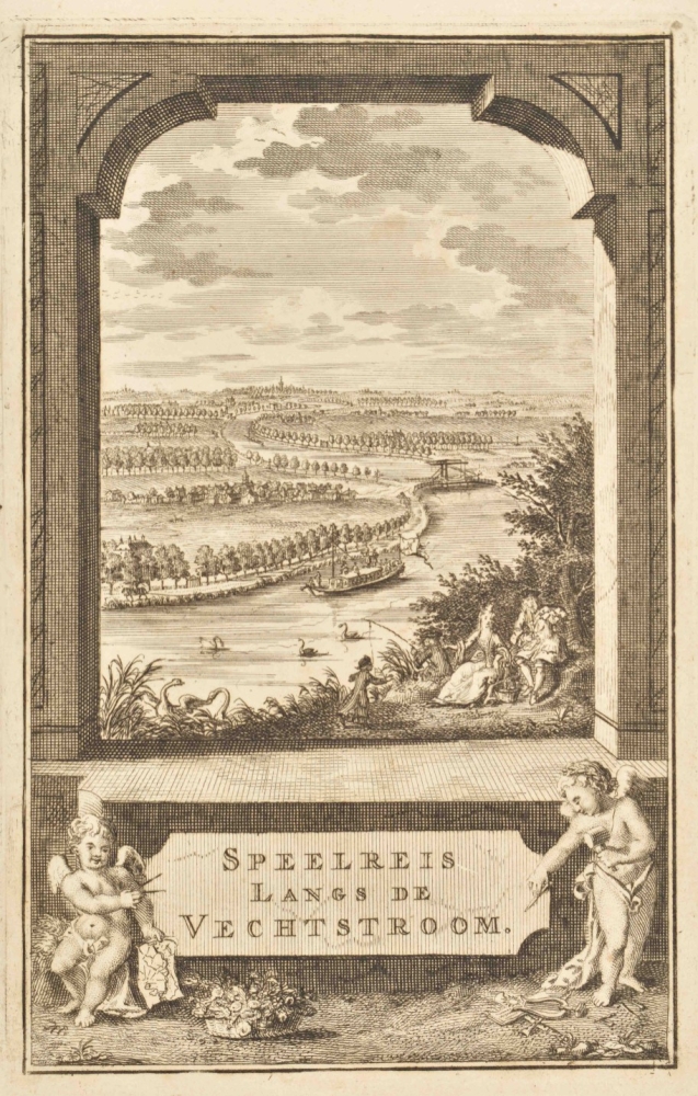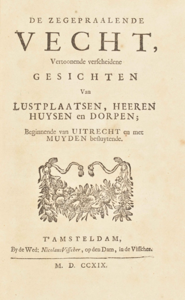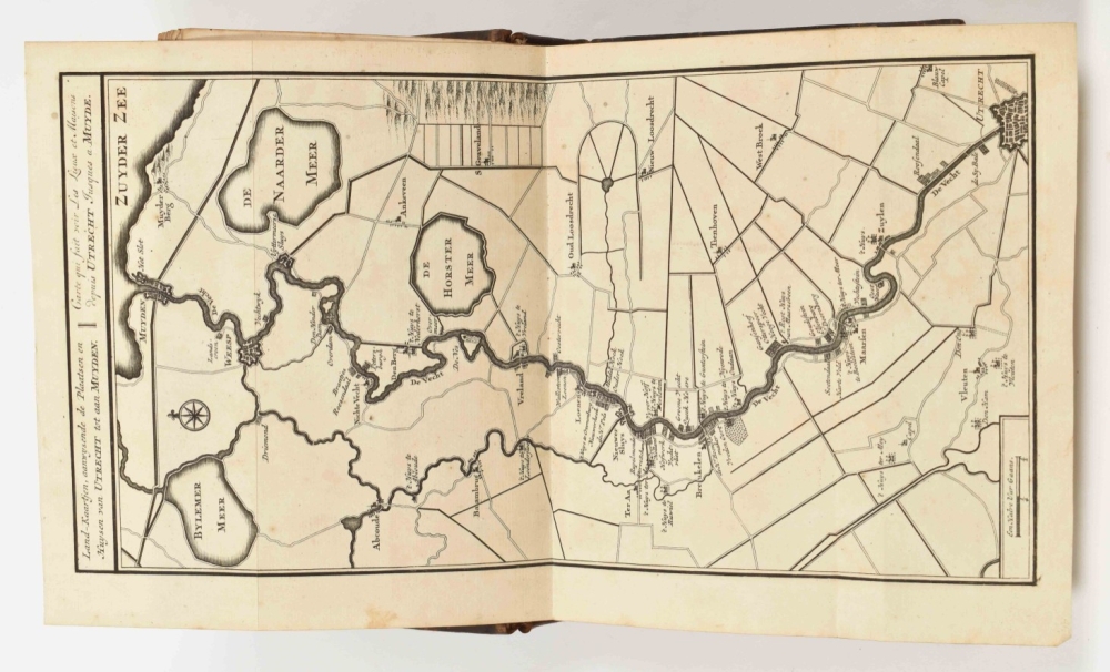 Vertoonende verscheide gesichten van lustplaatsen, heeren huysen, en dorpen; beginnende van Uitrecht en met Muyden besluytende. [Stoopendaal]. Amsterdam, Wed. N. Visscher, 1719. Here the scarce 8vo edition. Leather, boards with line border and typographical design. Ills. frontispiece with title of the added poem at the end. Title with vignette, 15,(1) and 39 pp., complete with the folding map and 98 double-page numbered engravings in strong impressions and caption in Dutch and French. Bound together with: Speel-reis langs de Vecht-stroom, op de uitgegeevene gezichten van de Zeegepraalende Vecht by Claas Bruin. Idem, n.d. Very good copy.