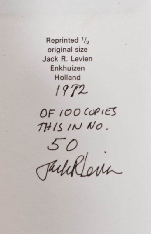 + Jack R Levien, Mohr Des Impressions 1879. Enkhuizen, Self-published, 1972. Hardcover, 9.5 x 6 cm, 11 pp. Edition of 100 copies, this is No. 50, signed on last page. (total 2)