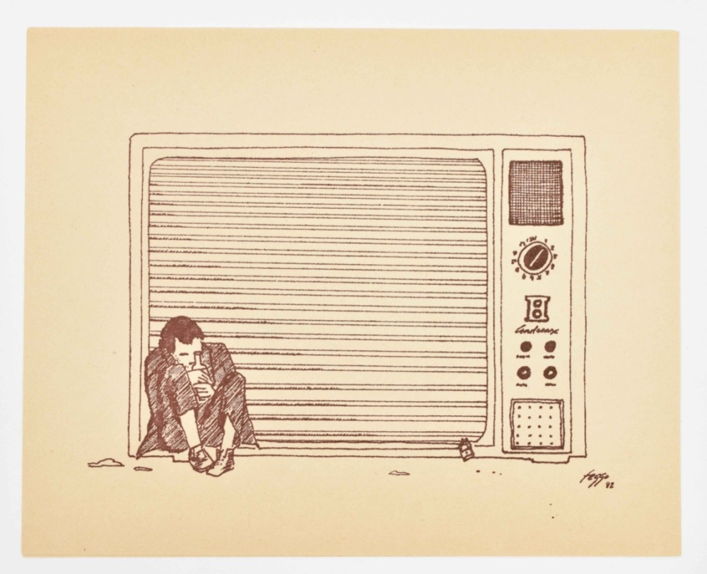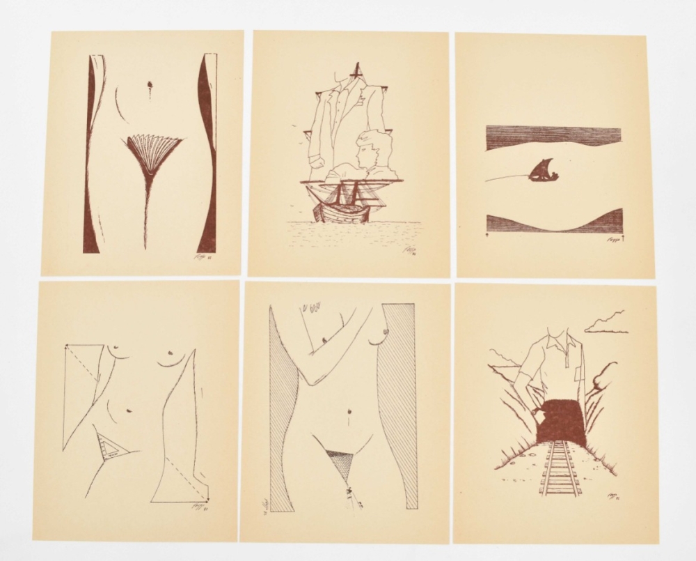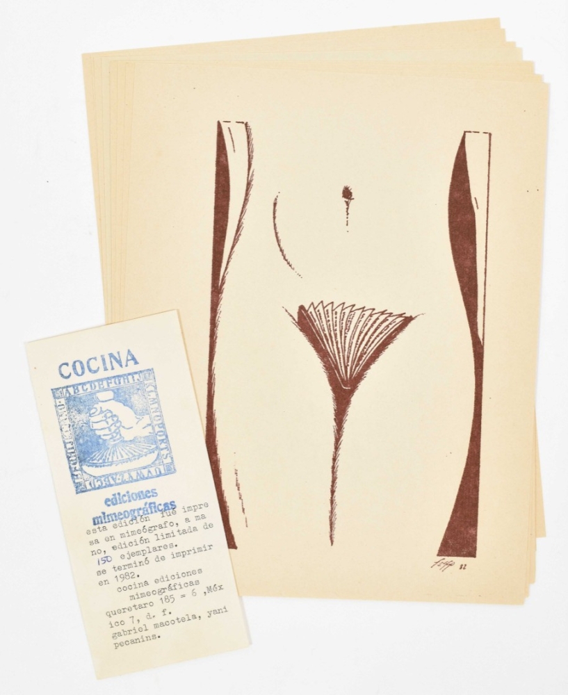 Mexico City, Cocina Ediciones Mimeográficas, 1982. Illustrated envelope, 26 x 19 cm, housing 9 loose sheets, 21.5 x 17 cm, with drawings stencilled black and dark brown on cream paper.