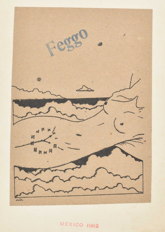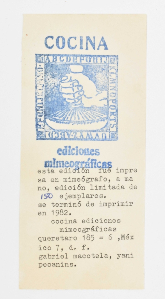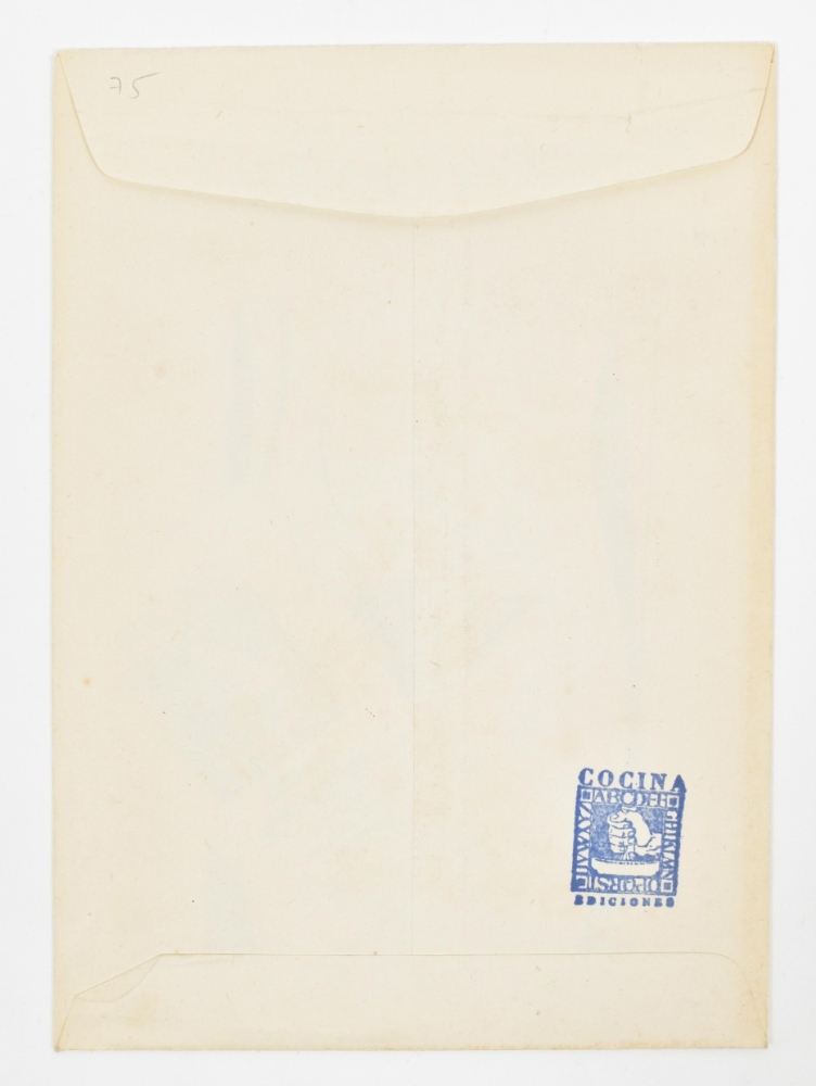 The envelope features a mimeo-print on brown packing paper with 'Feggo' stamped in blue and 'Mexico 1982' in red. The logo of Cocina Ediciones is stamped on verso. Inserted is a loose card with publishers information, the edition consists of 150 copies. Envelope is fine, sheets are mint.