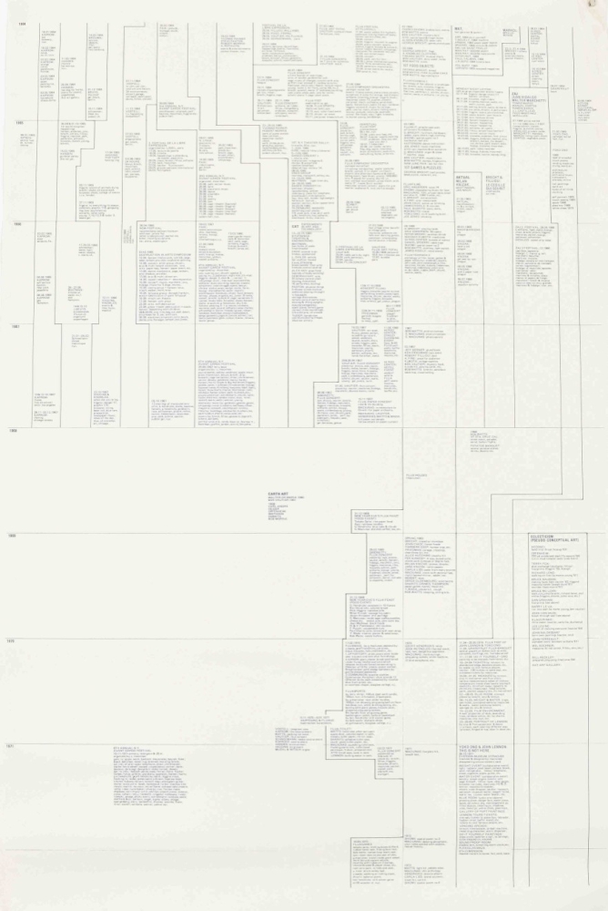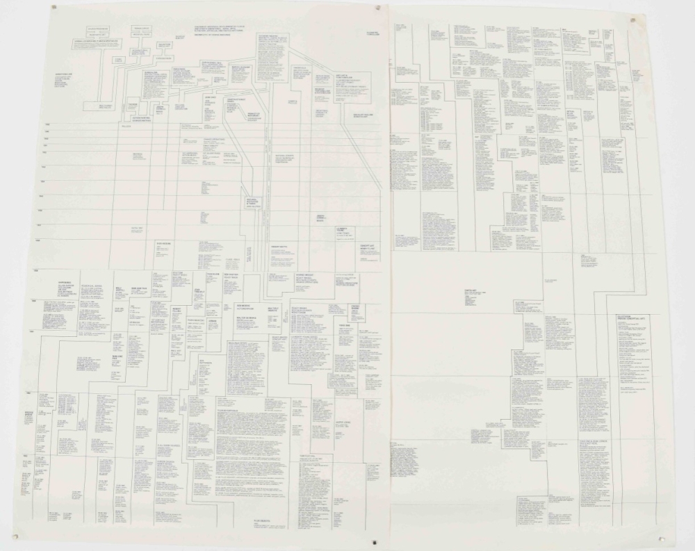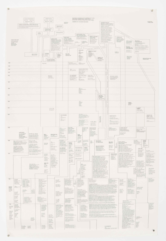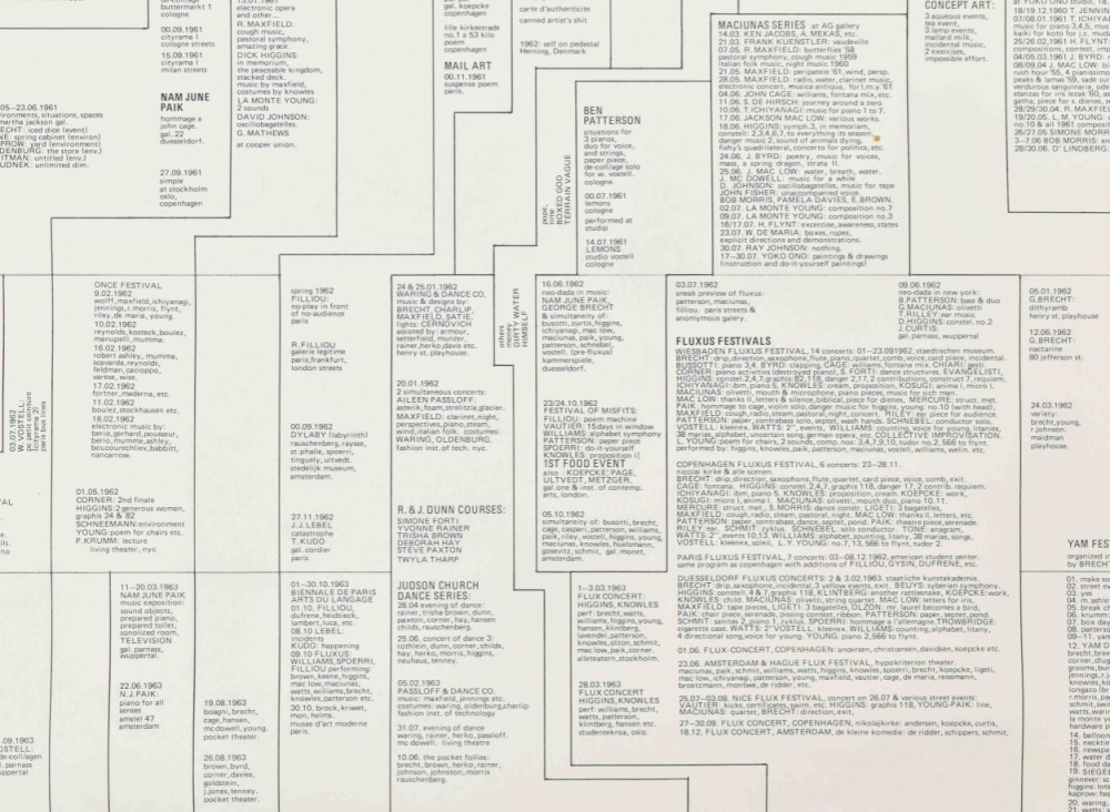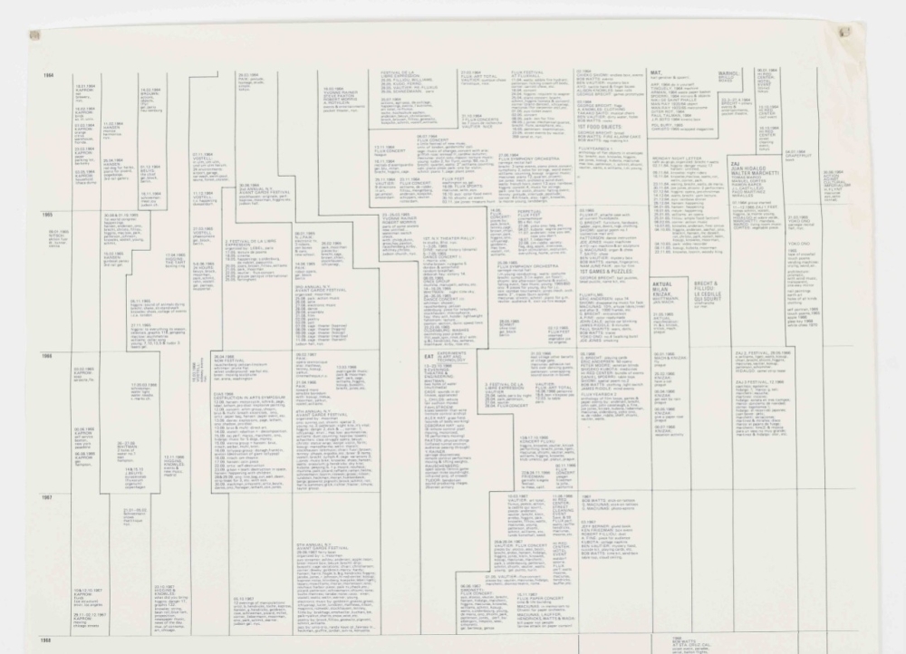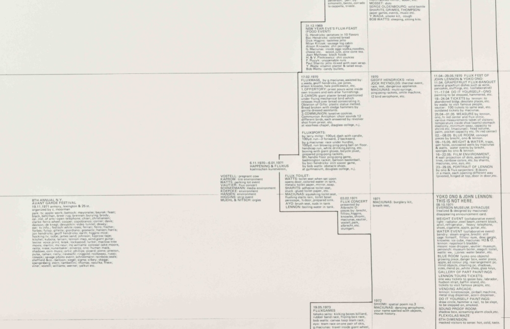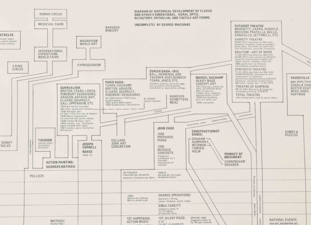 Also known as The Chart, Maciunas' diagram outlines the development of Fluxus while situating it within a wider cultural and art historical spectrum. The timeline begins with Roman circuses, medieval fairs, and Futurist theatre and moves into Dada, Surrealism, and Vaudeville before addressing developing genres like Earth Art and Happenings and finally ending with Flux Games in 1973.