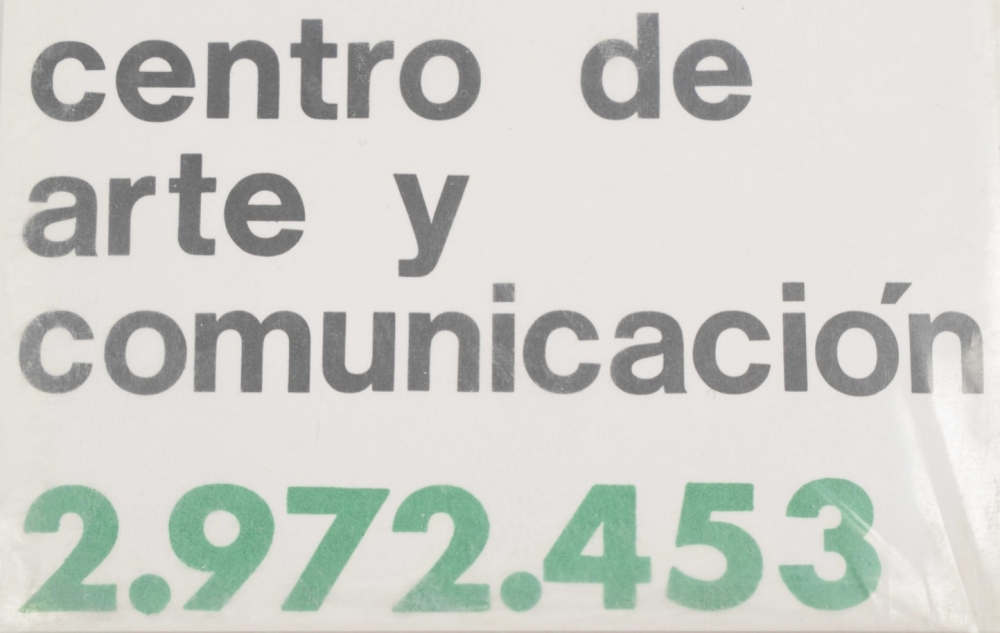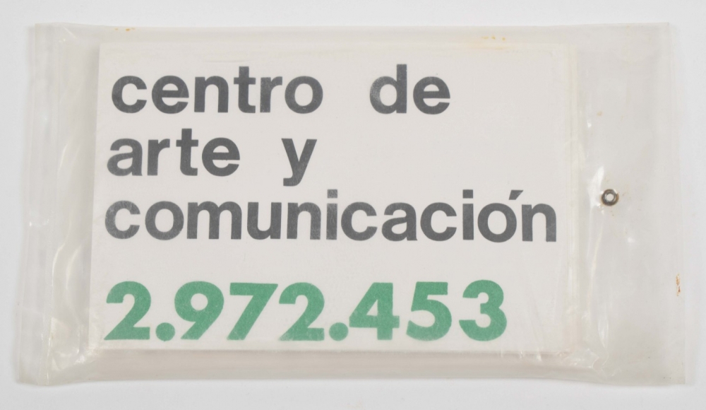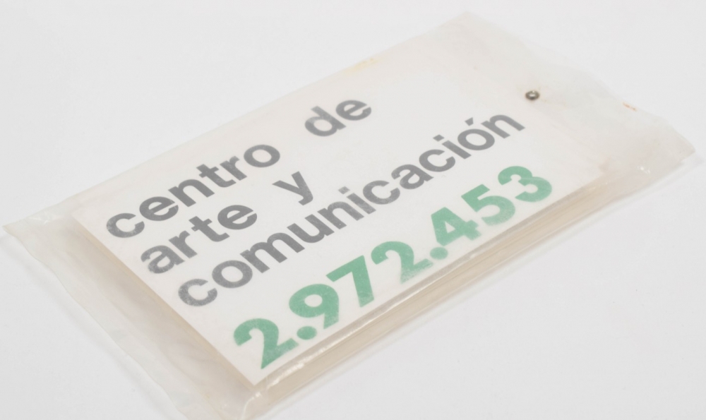 Exhibition organized by Lucy R. Lippard and Jorge Glusberg at the Centro de Arte Y Communicacion (CAYC), Buenos Aires, Argentina, in December 1970. Third catalogue in an ongoing series by Lippard. Consists of 43 loose cards, 10 x 15.5 cm. Held in a transparent plastic bag, 12 x 22 cm.
