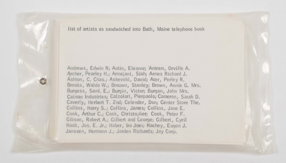 The cards bear biographical information, statements and documentation about the artists, in addition to exhibition statements by Lippard and Glusberg. Artists include Eleanor Antin, Siah Armajani, David Askevold, Stanley Brouwn, Victor Burgin, Pierpaolo Calzolari, Don Celender, James Collins, Christopher Cook, Gilbert & George, Ira Joel Haber, and Richards Jarden. Item in mint condition, the sealed plastic back has never been opened. Extremely rare.
