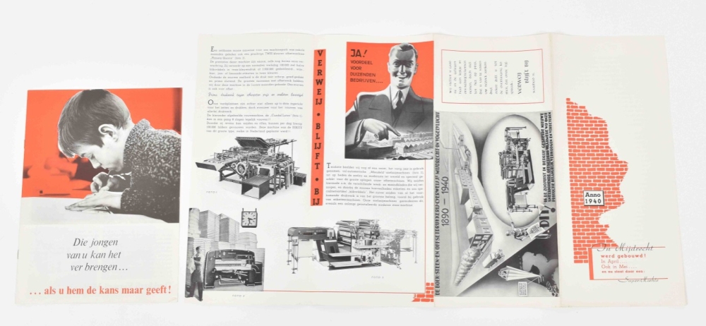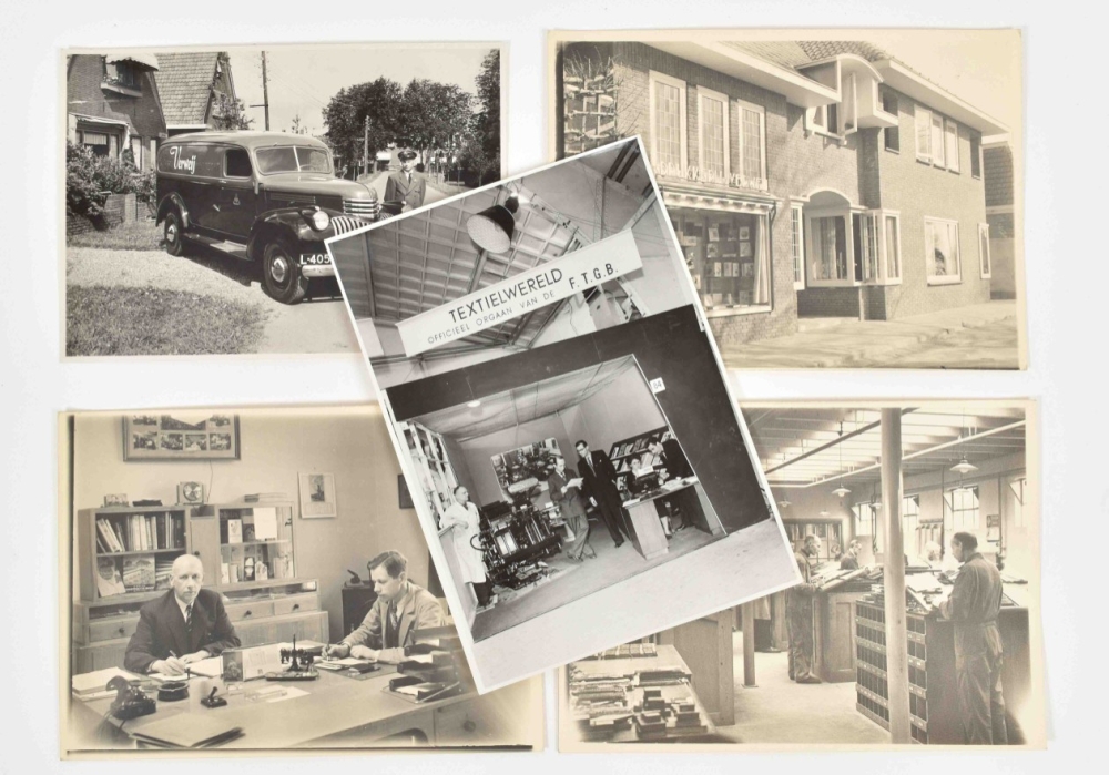 Contains: circa 150 photos of workplaces, offices, company trips 1930s-1950s; ca. 15 glass photo negatives, circa 50 leaflets, booklets, samples and promotional material, mid. 20th century.