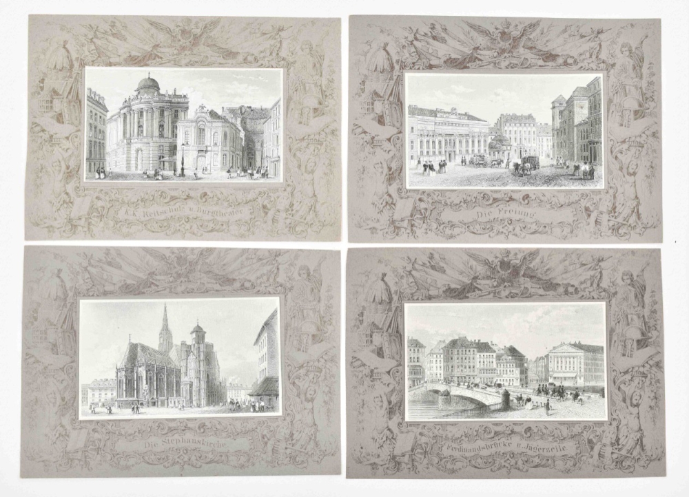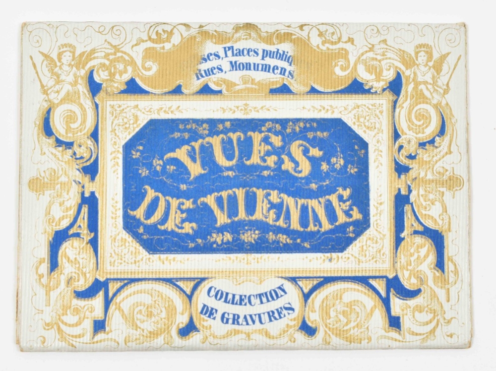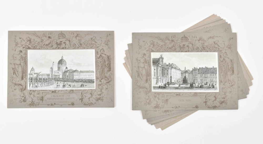 de ses eglises, places publiques, rues, monumens. Collection de gravures. (Vienna), n.publ., n.d. (c. 1855), probably printed by A. Payne, complete set of 2 x 12 fine steel-engr. views, each 5 x 8.5 cm and laid down on orig. dec. grey paper mounts with the titles below, kept in 2 orig. paper envelopes, 10.5 x 14 cm.