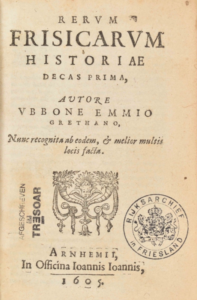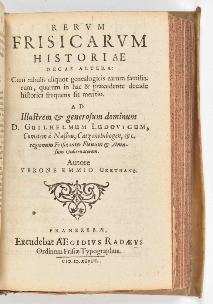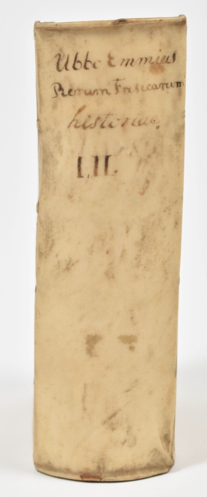 Ubbo Emmius. Arnhem, J. Johannes, 1605. Bound with: Rerum Frisicarum historiae decas altera. Idem. Franeker, Gillis van den Rade, 1598. 2 (of 4) parts in 1 vol. (16), 425, (13), (48), 400, (4) pp. Contemp. overlapping vellum, ms. title on spine, red sprinkled edges.