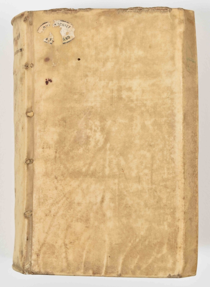 The first part in the second and enlarged edition, the second part in the first Franeker edition. Mild browning, remains of ticket on front board, stamp on title page.
