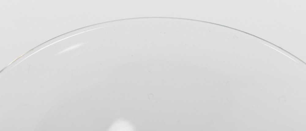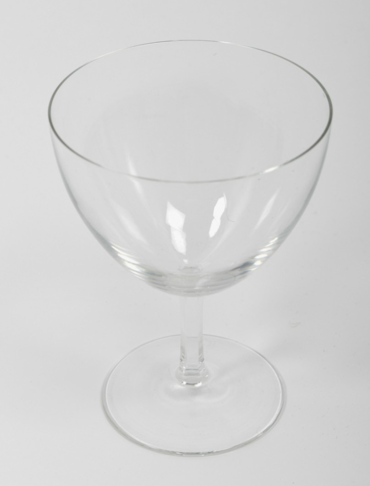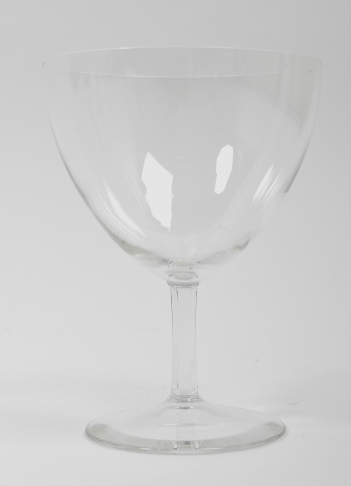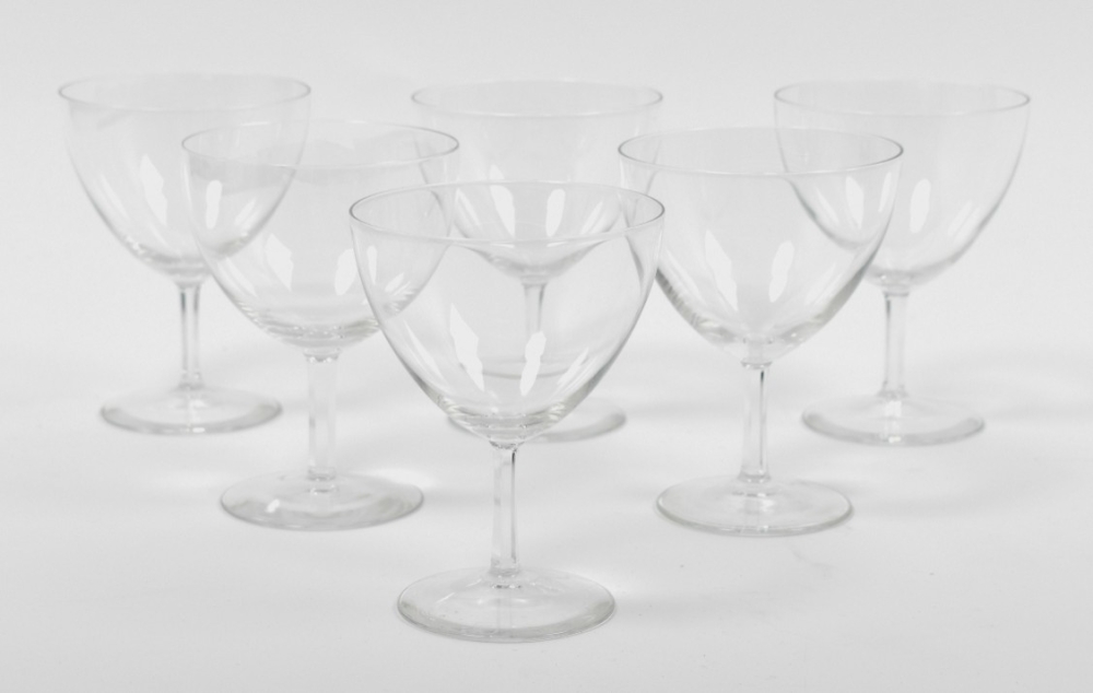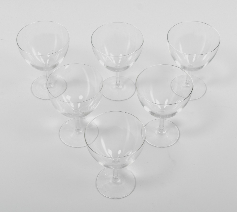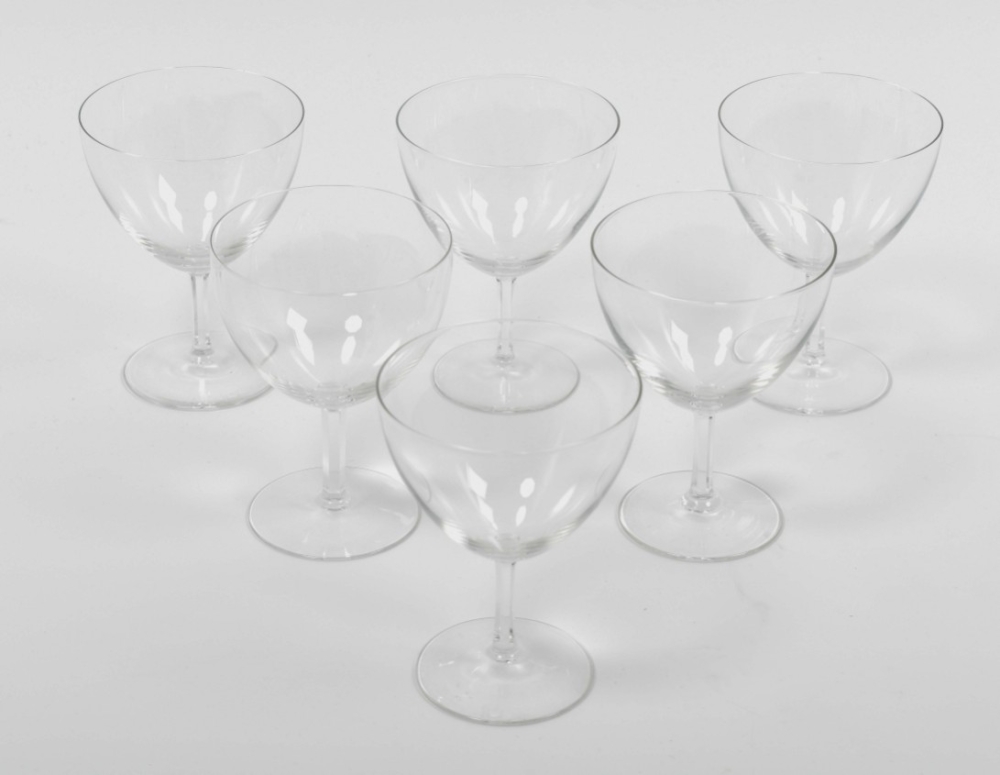 Six gilde glasses after design by A.D. Copier for Leerdam. Colourless, round flat foot, ovoid bowl. Height 13 cm.