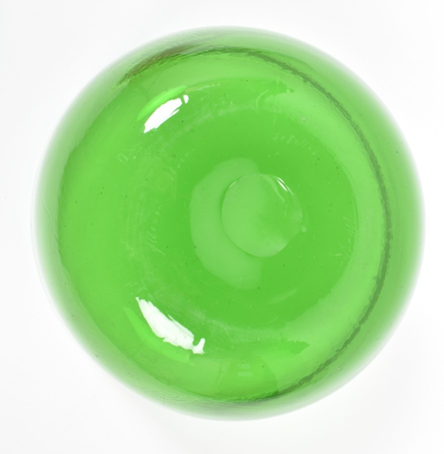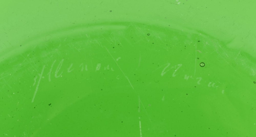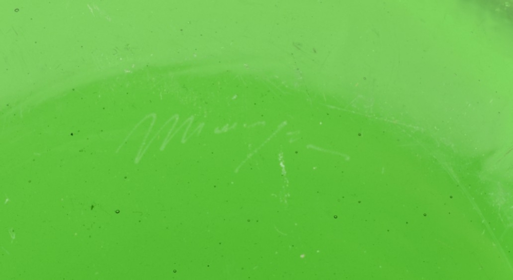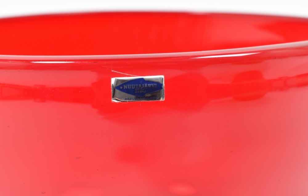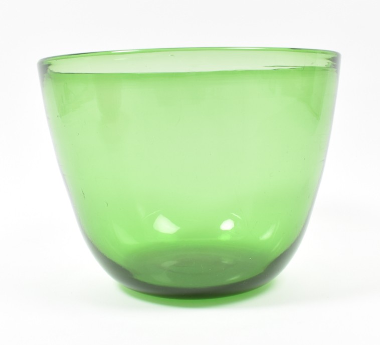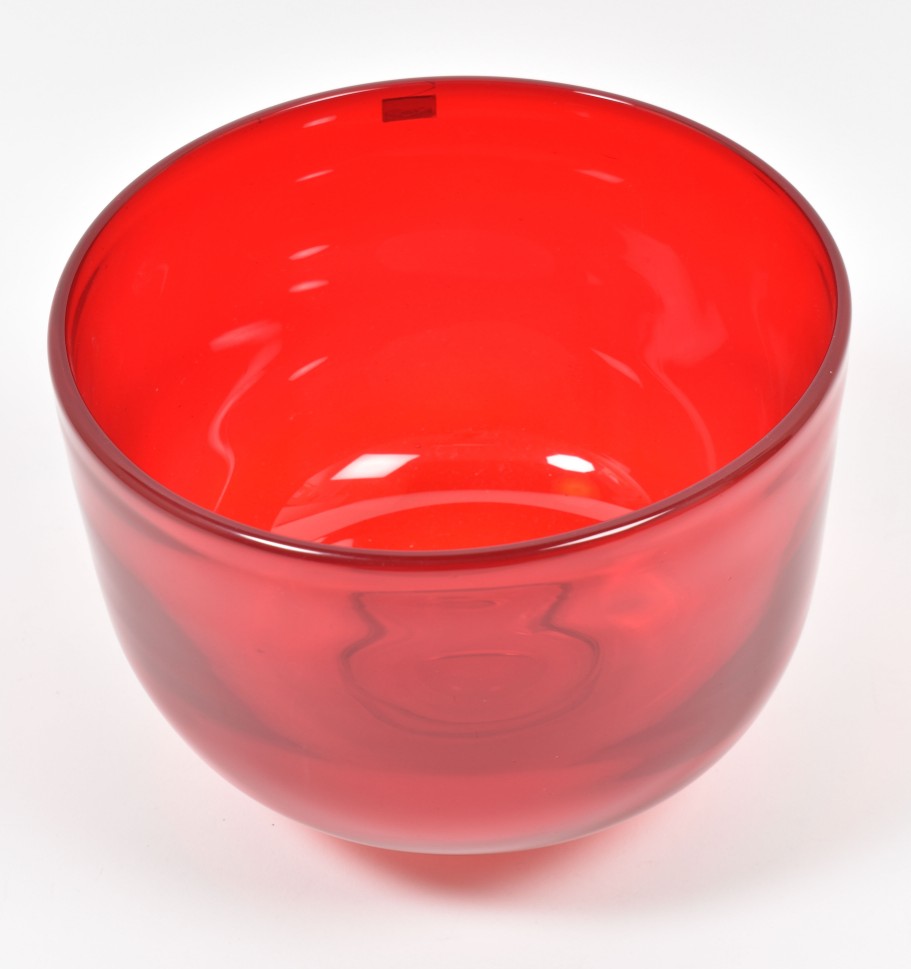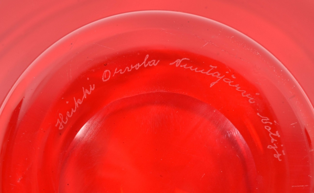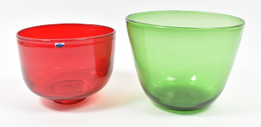 (1) A ruby red glass bowl. Base signed Heikki Orvolo Nuutajarvi. Height 18 cm, diameter 25 cm. (2) Green glass bowl with illegible signature. Height 21 cm.
